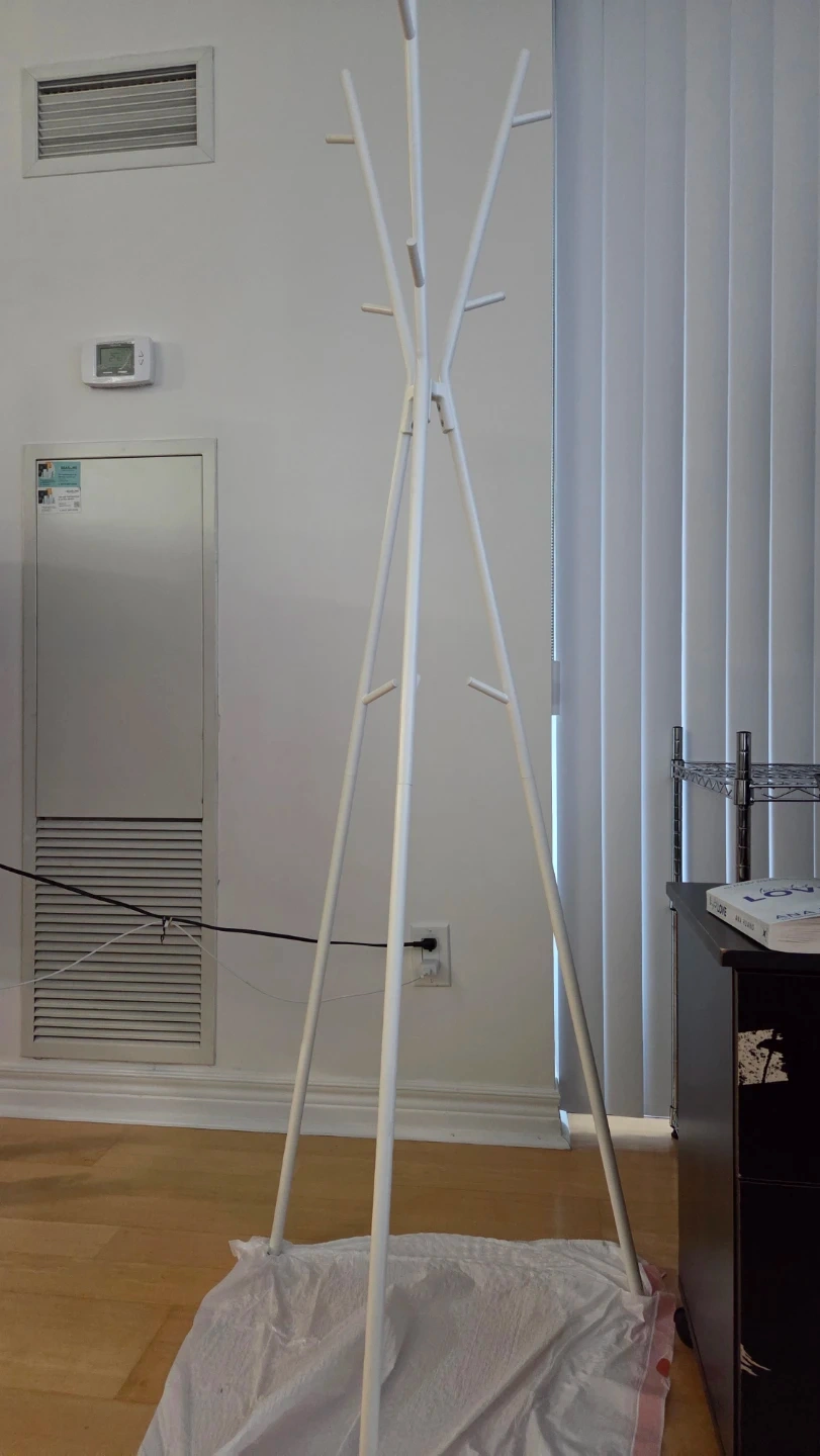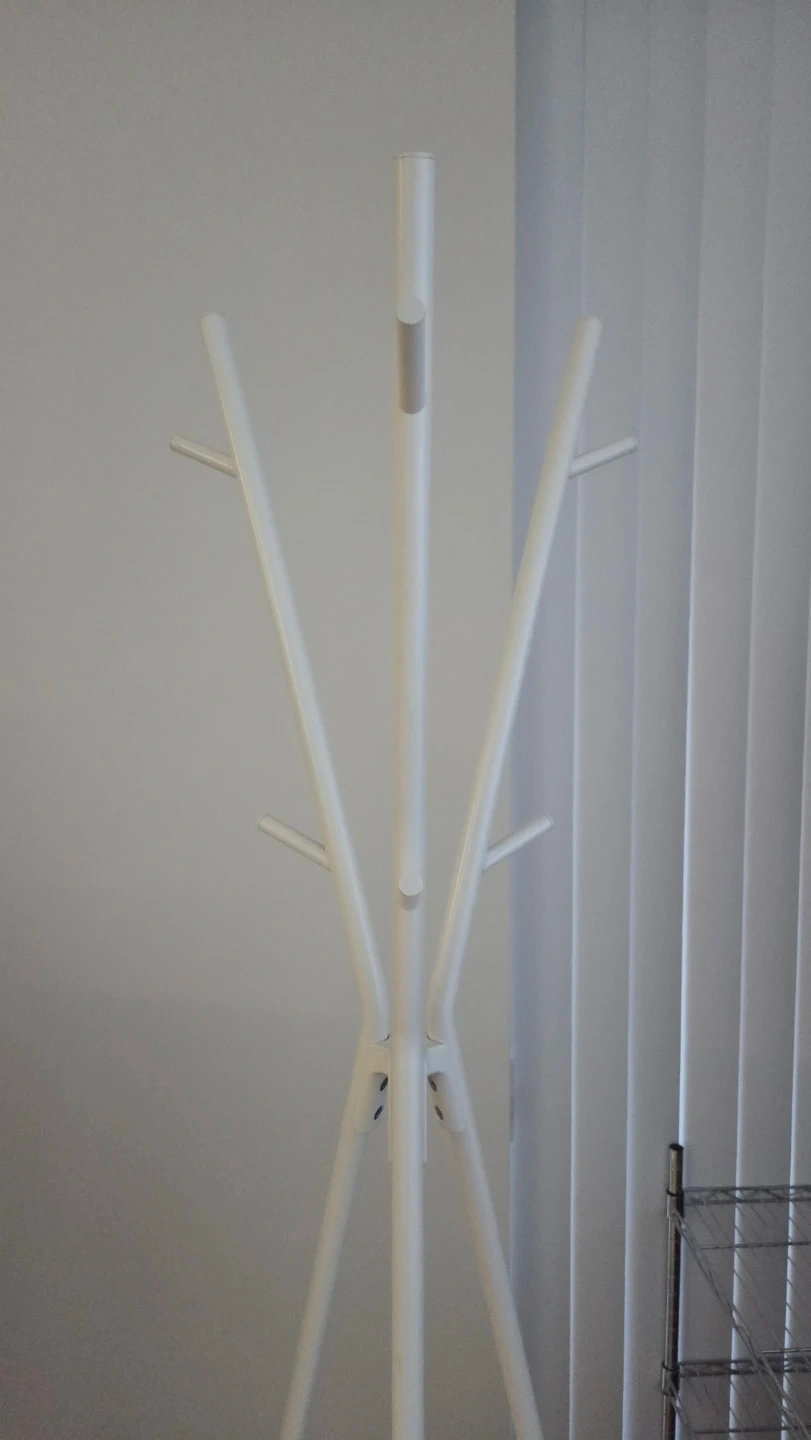 This is a white coat rack. It's made of metal and has a tripod base. It stands about 5.5 feet tall with multiple hooks for coats and accessories. It's a practical addition to any entryway or bedroom!