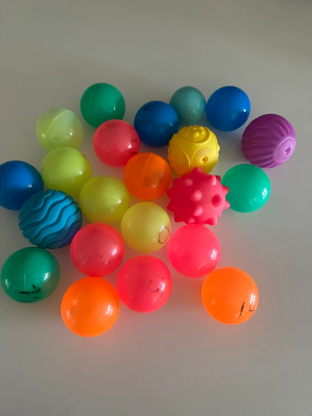 486Variety of coloured balls, some with textured surfaces. Some balls have a letter written on them.