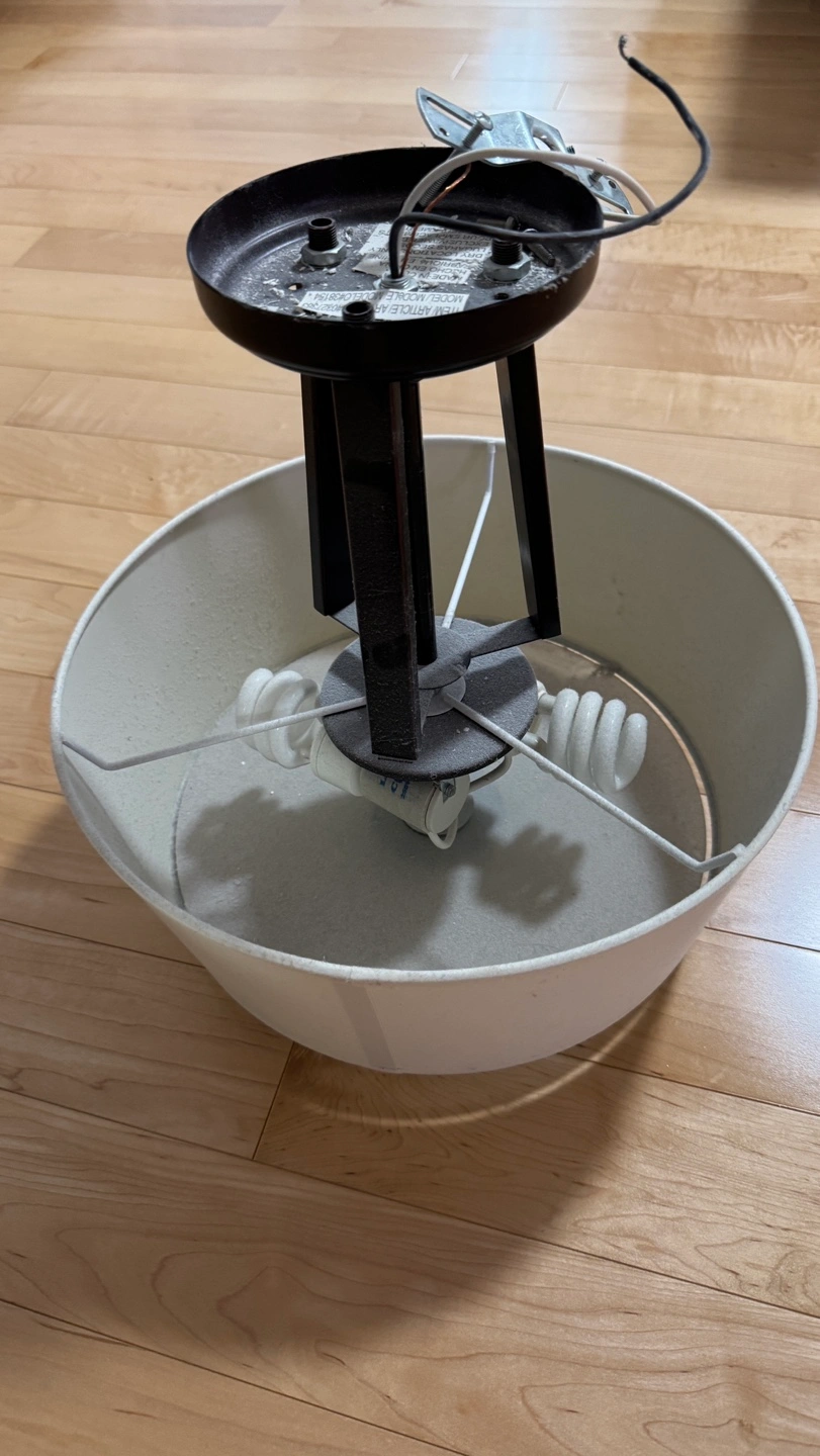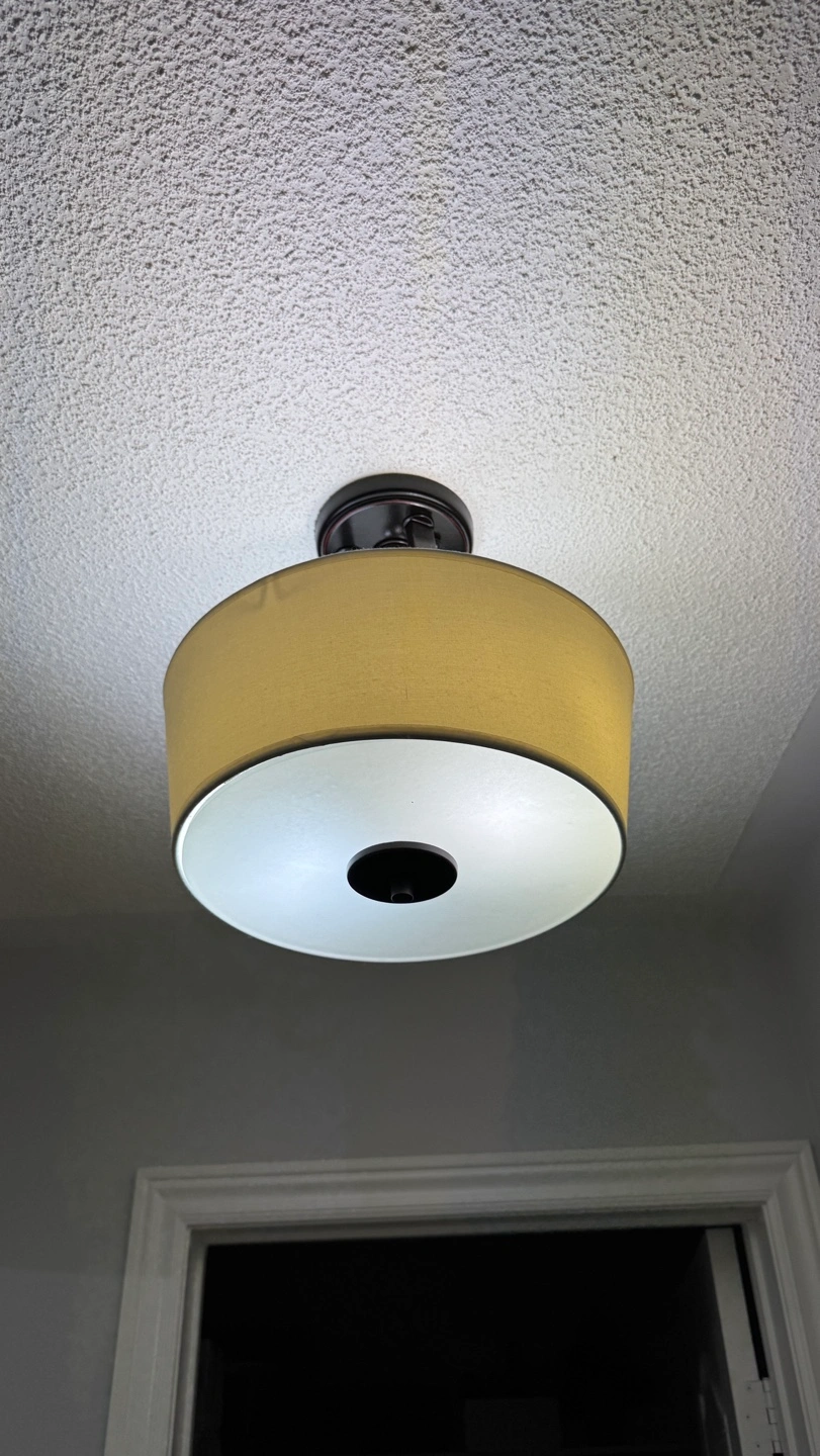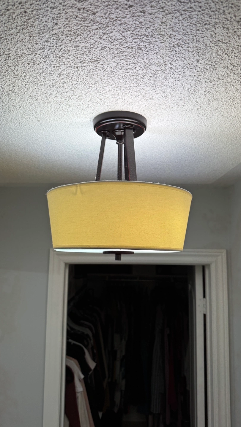 171Ceiling light fixture with a yellow shade. It has a black metal frame and uses two light bulbs. All the lightbulbs used are included in sale! Had it in the hallway and switched it out. Meet up in Vaughan!