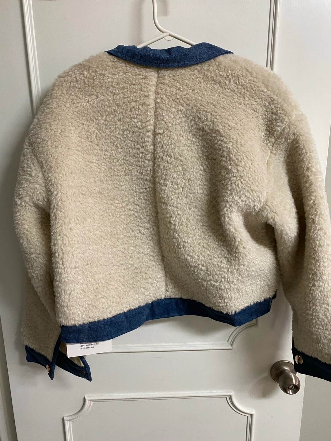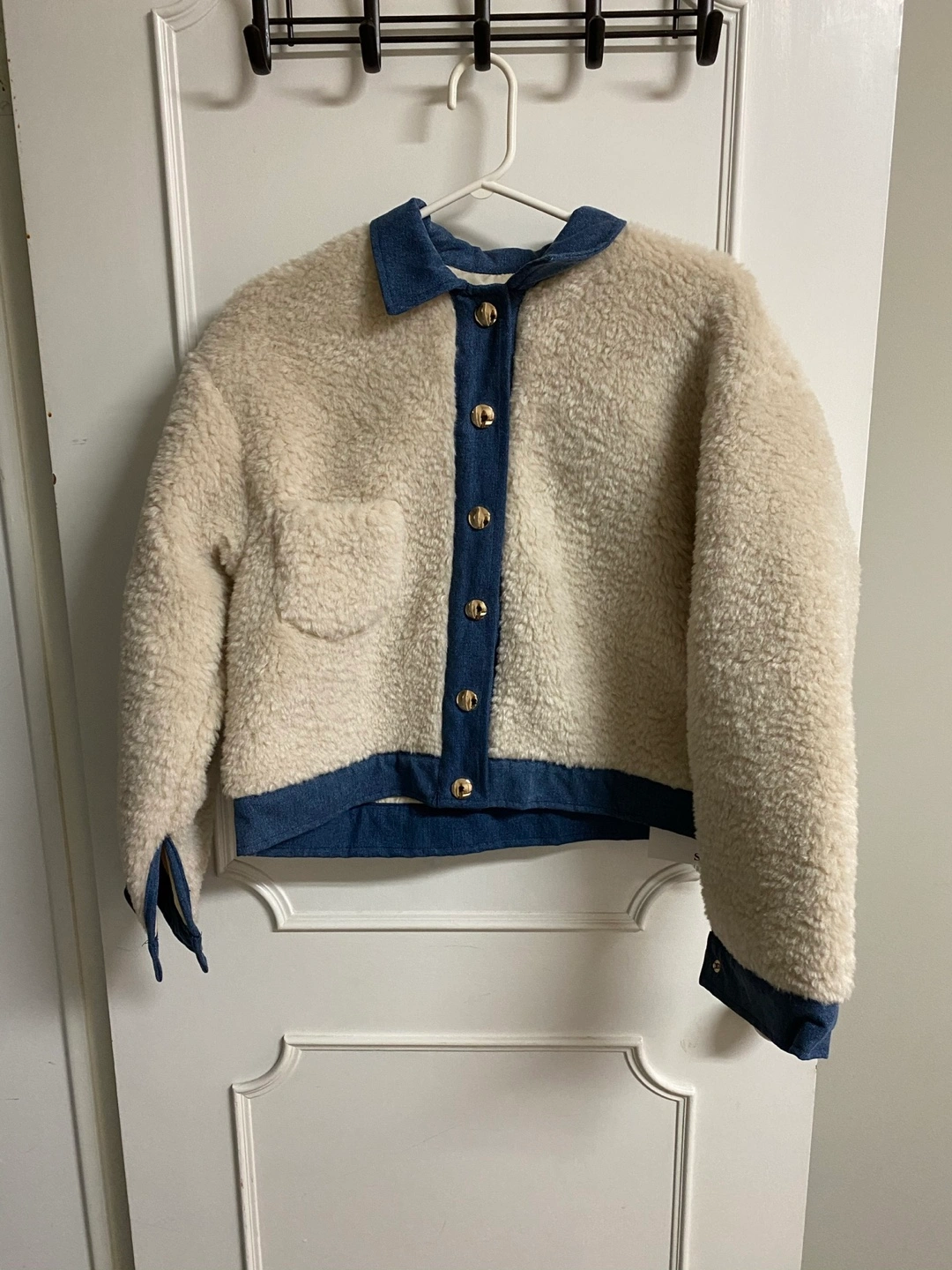 53BNWT KKStudio Jacket. Size S. Cash and pickup only Bathurst and finch area , White fleece jacket with denim trim, snap buttons, and pockets.
