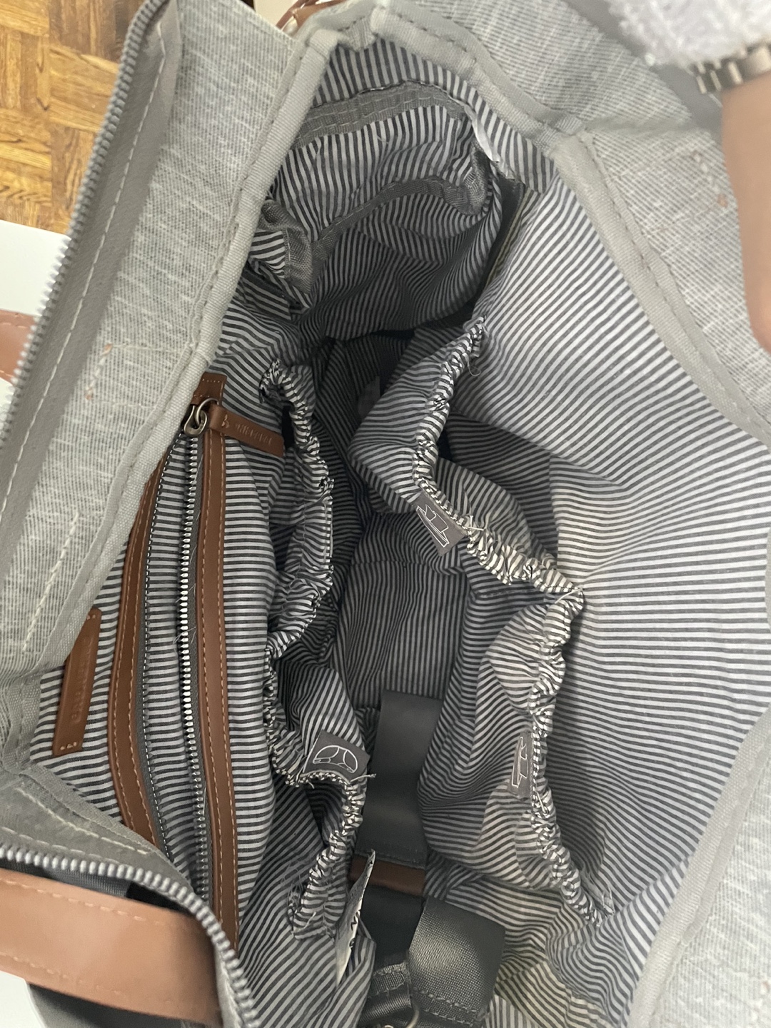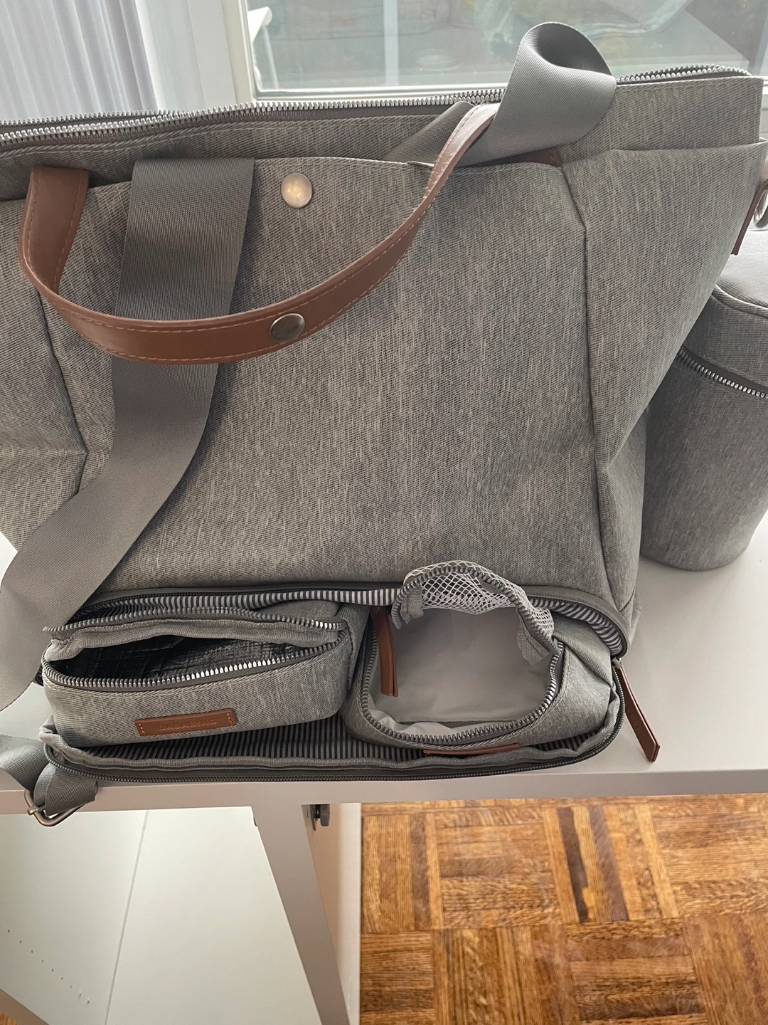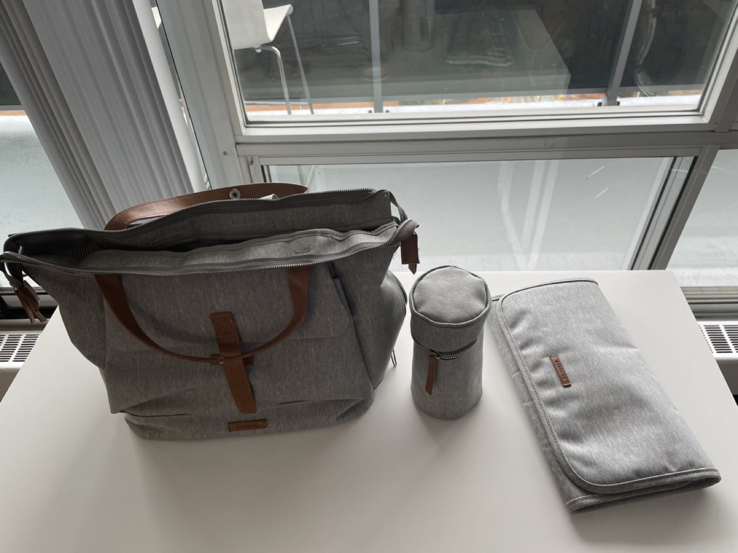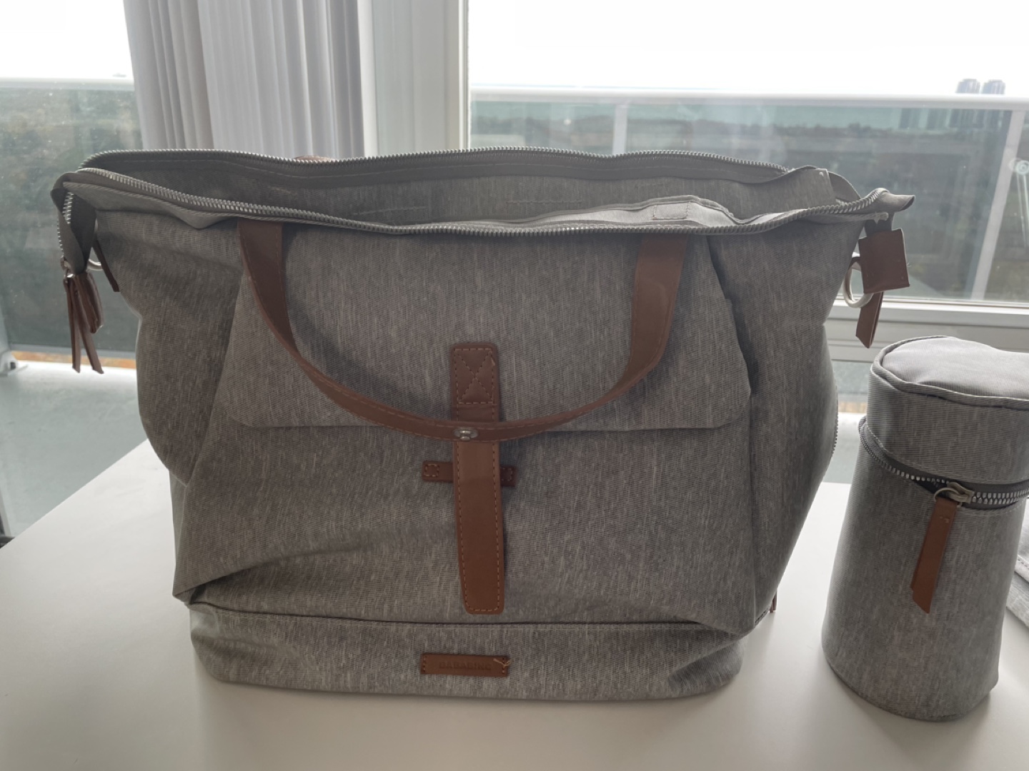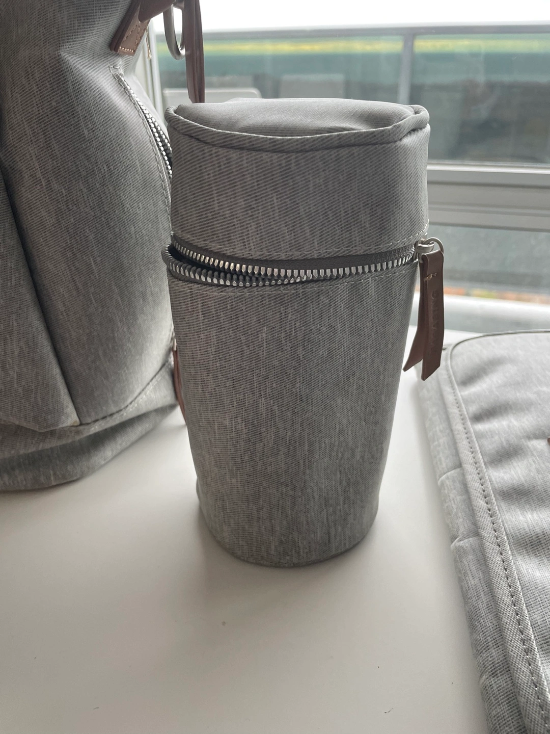 Diaper bag, bottle holder and changing mat. Grey colour with brown accents.
