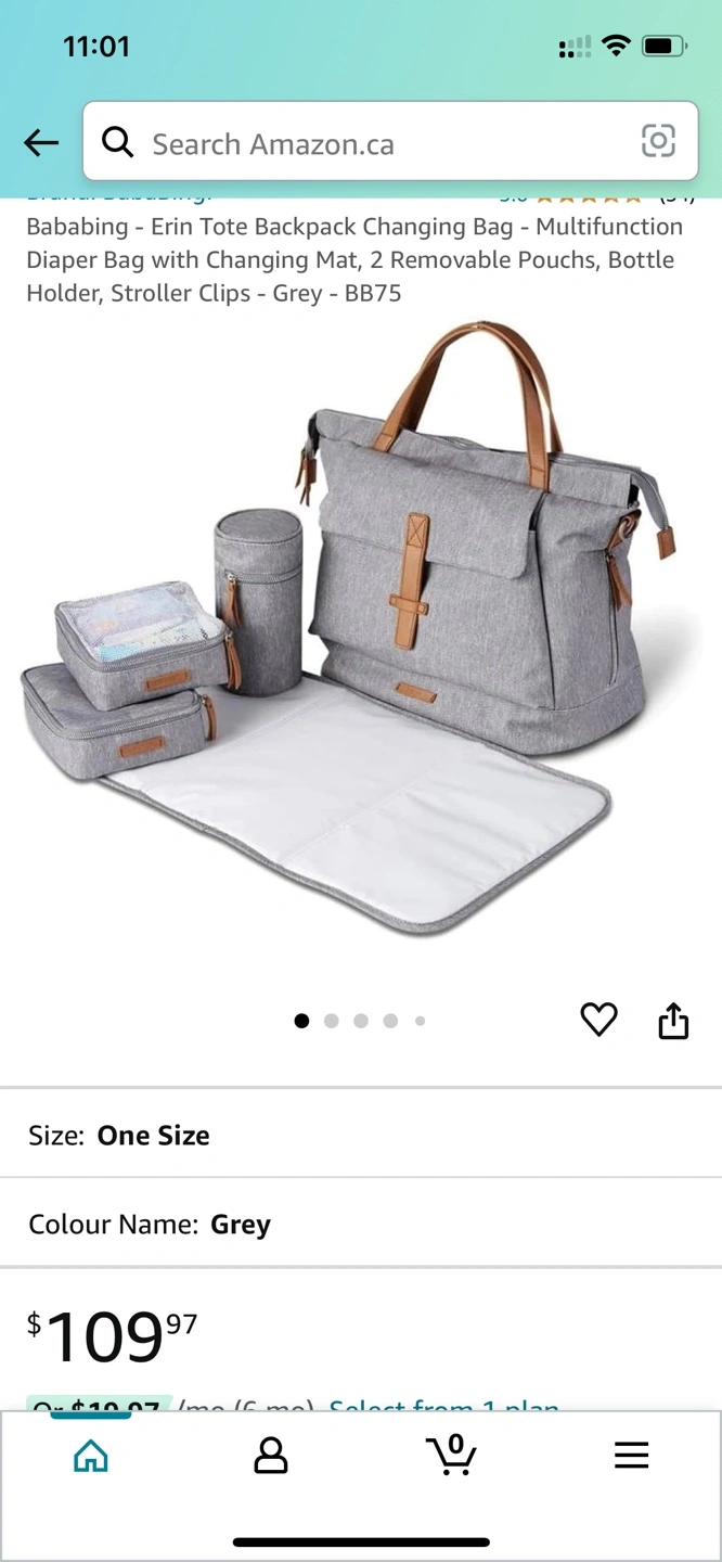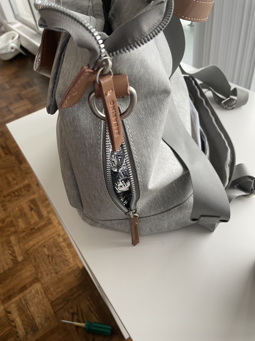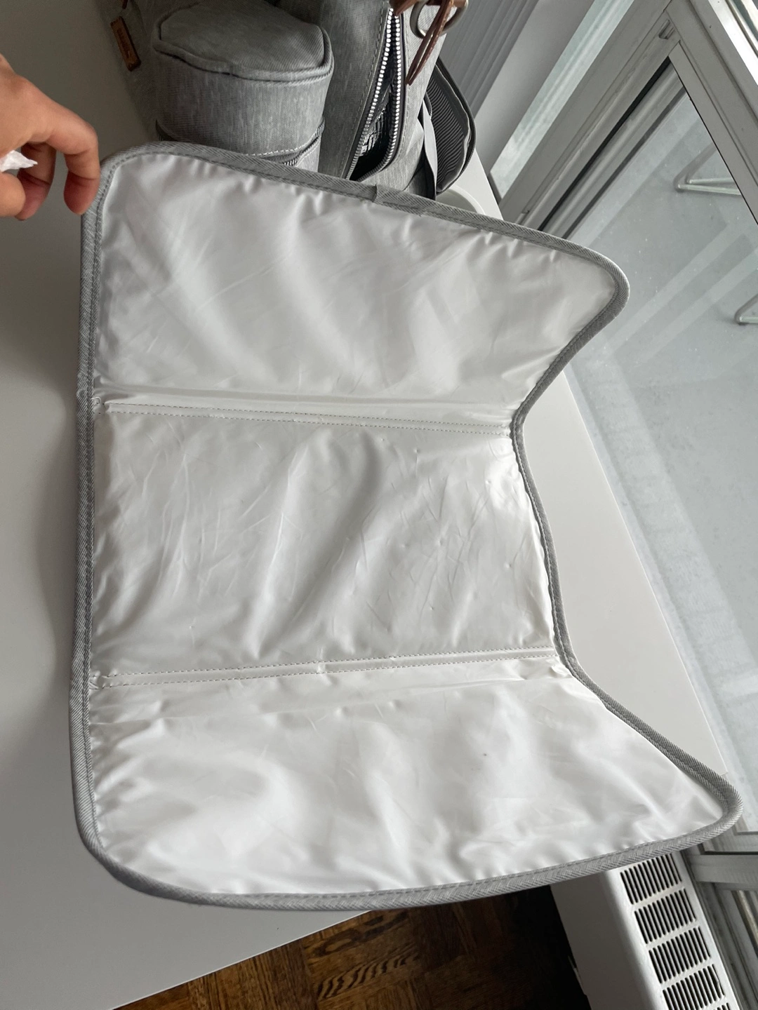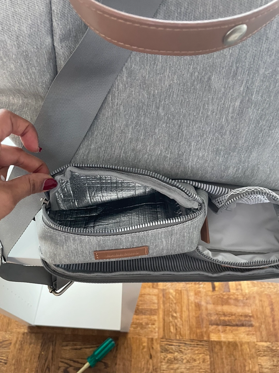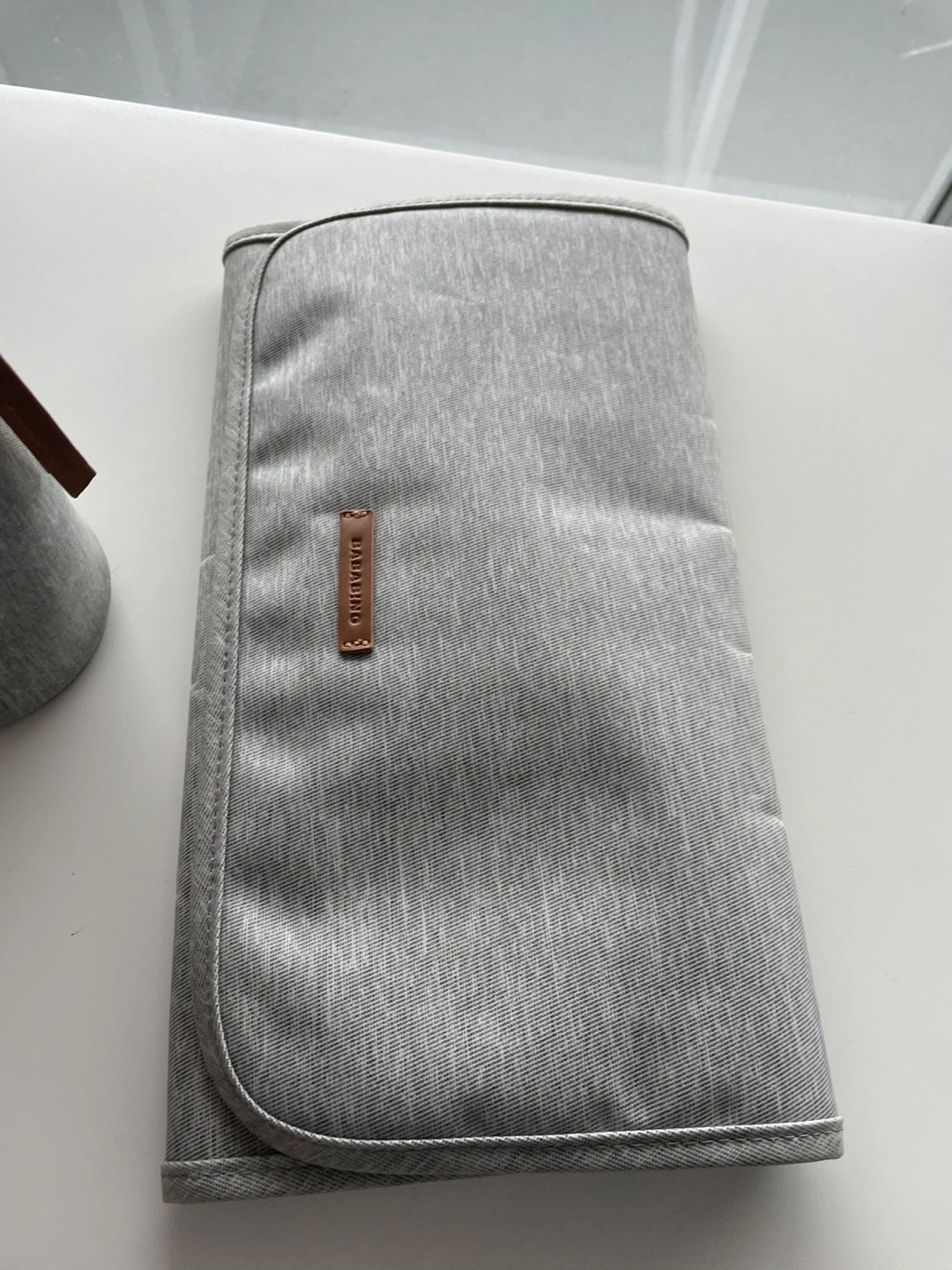 Diaper bag, bottle holder and changing mat. Grey colour with brown accents.