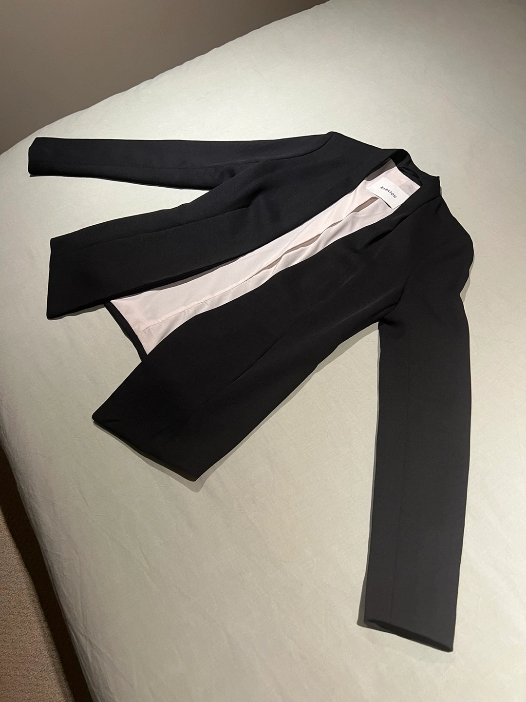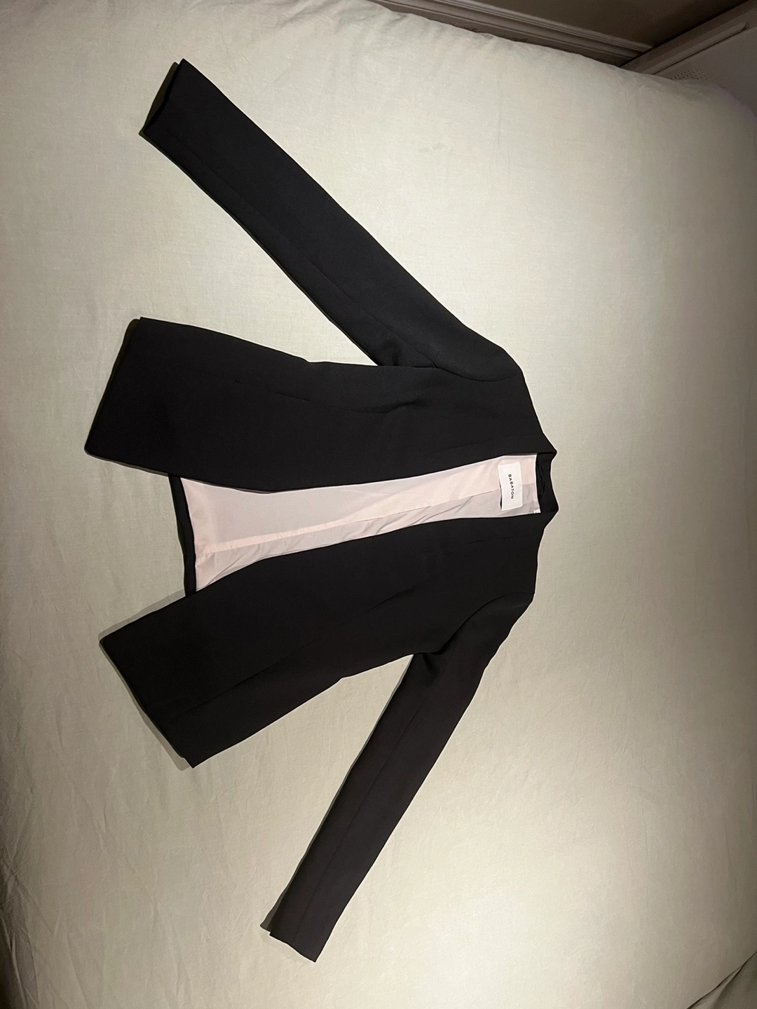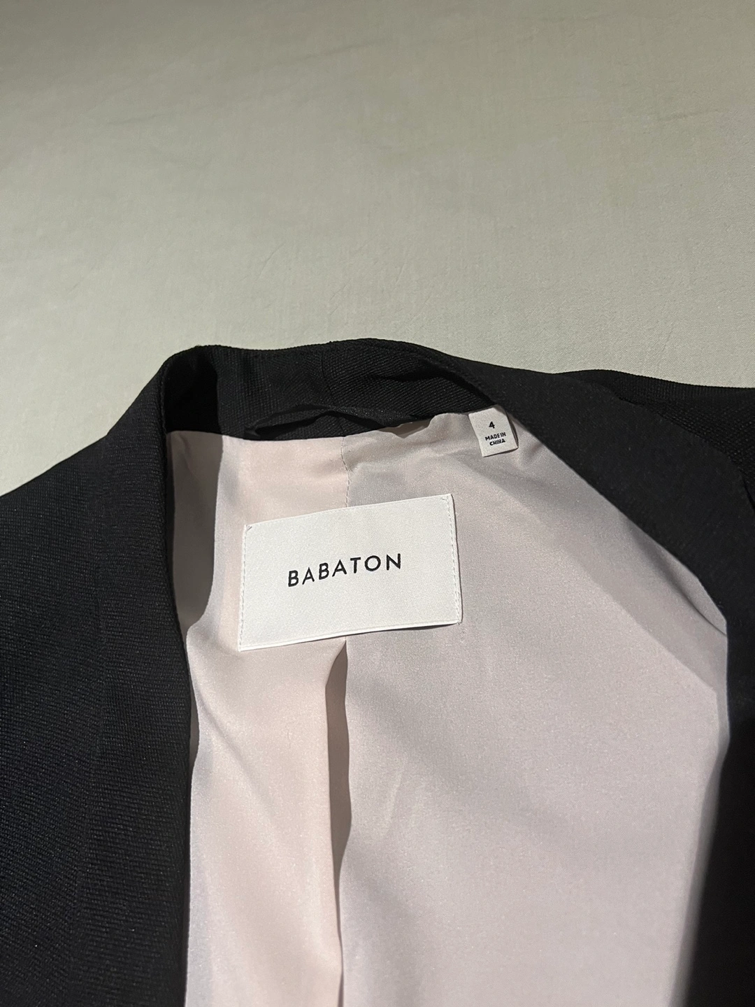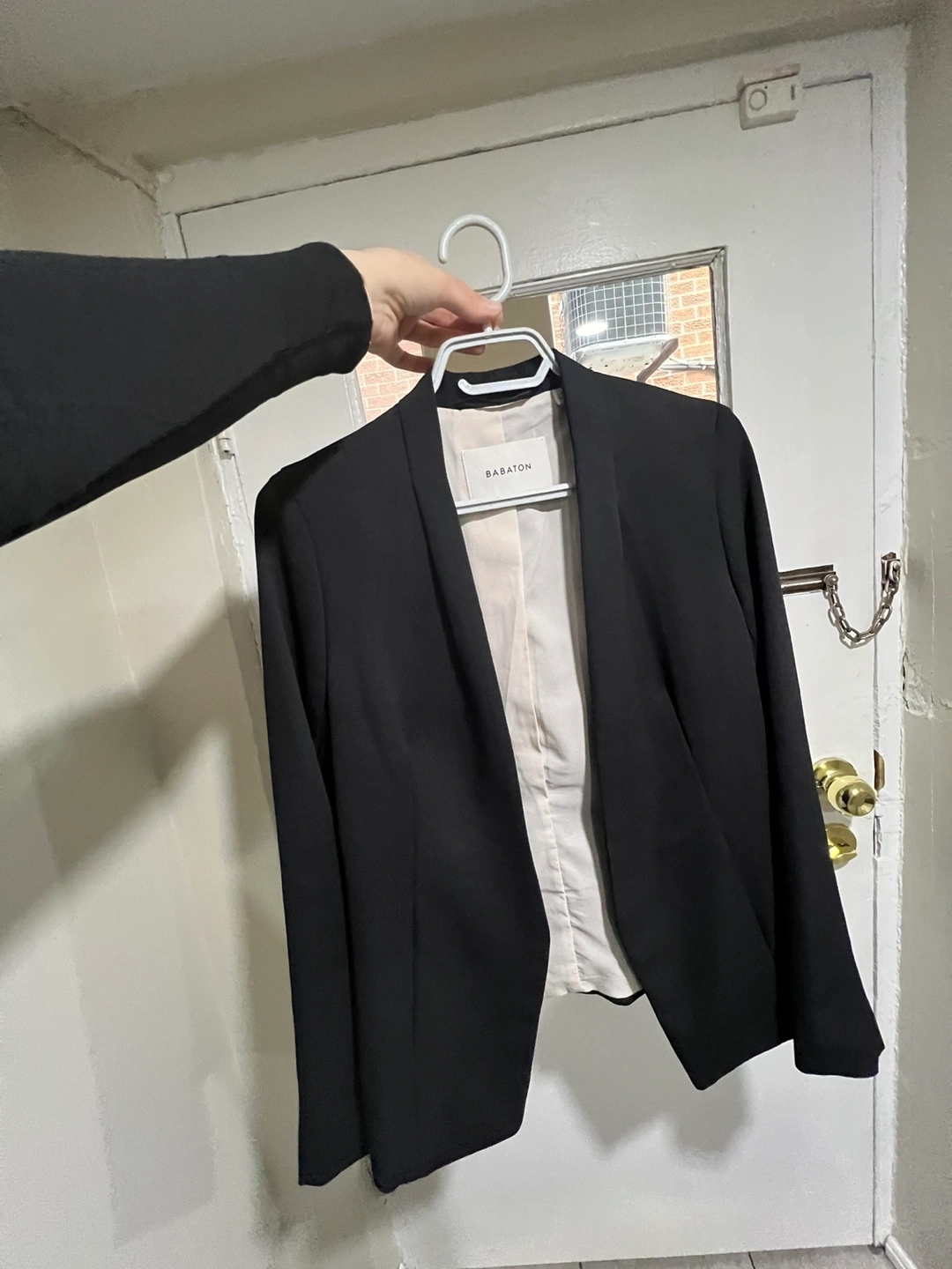 This is a black Babaton blazer purchased from Aritzia before 2019 so it’s good quality. I’ve only worn it twice for job interviews so it’s practically new. It has no stains or noticeable wear as it’s only been worn twice. I’m no longer able to fit in it.