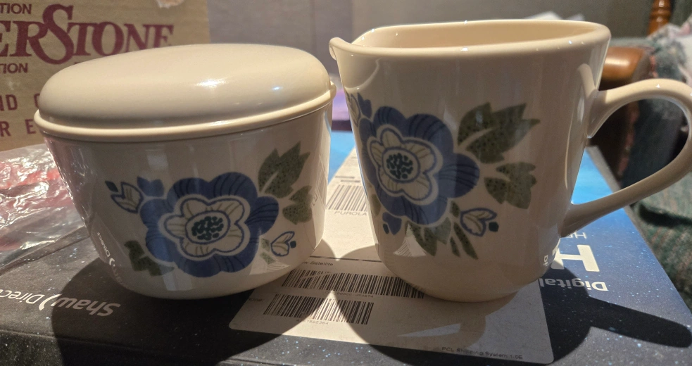843Sugar and creamer set in the Belle Grove pattern. Features blue and green floral design.