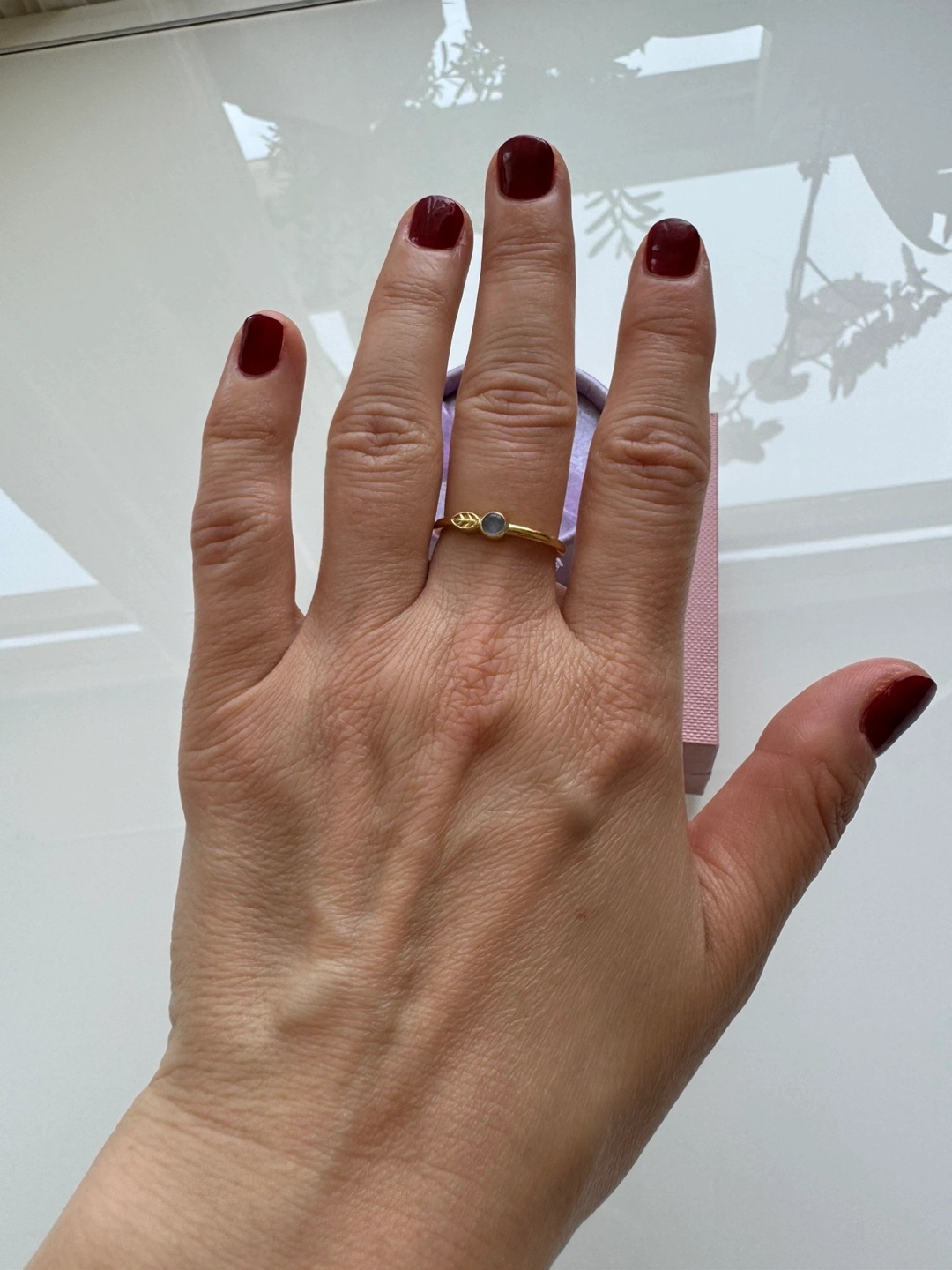 1000+Gold plated sterling silver ring with a blue stone and leaf detail. It fits like a sz 6.5-7