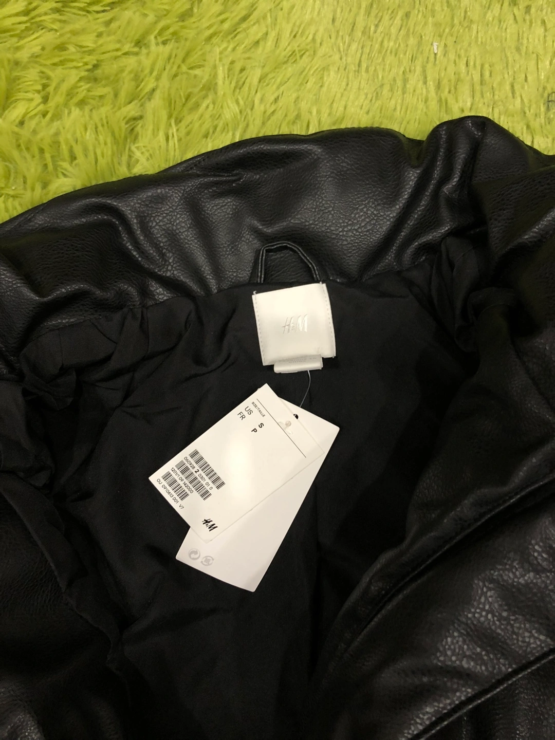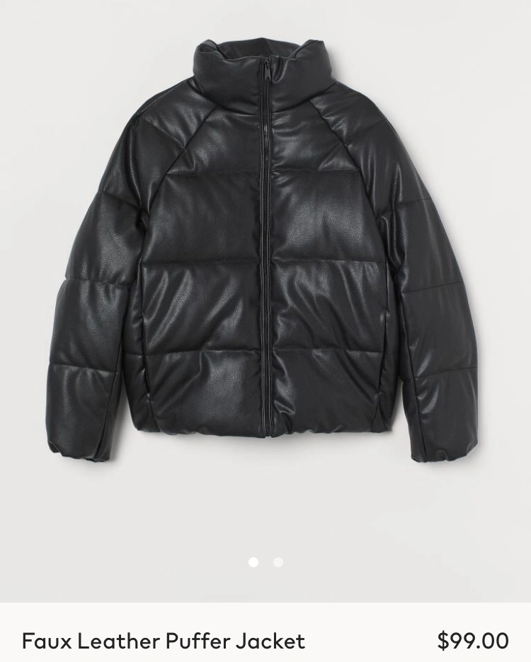 Black faux leather puffer jacket. Has a high collar and a zipper closure.