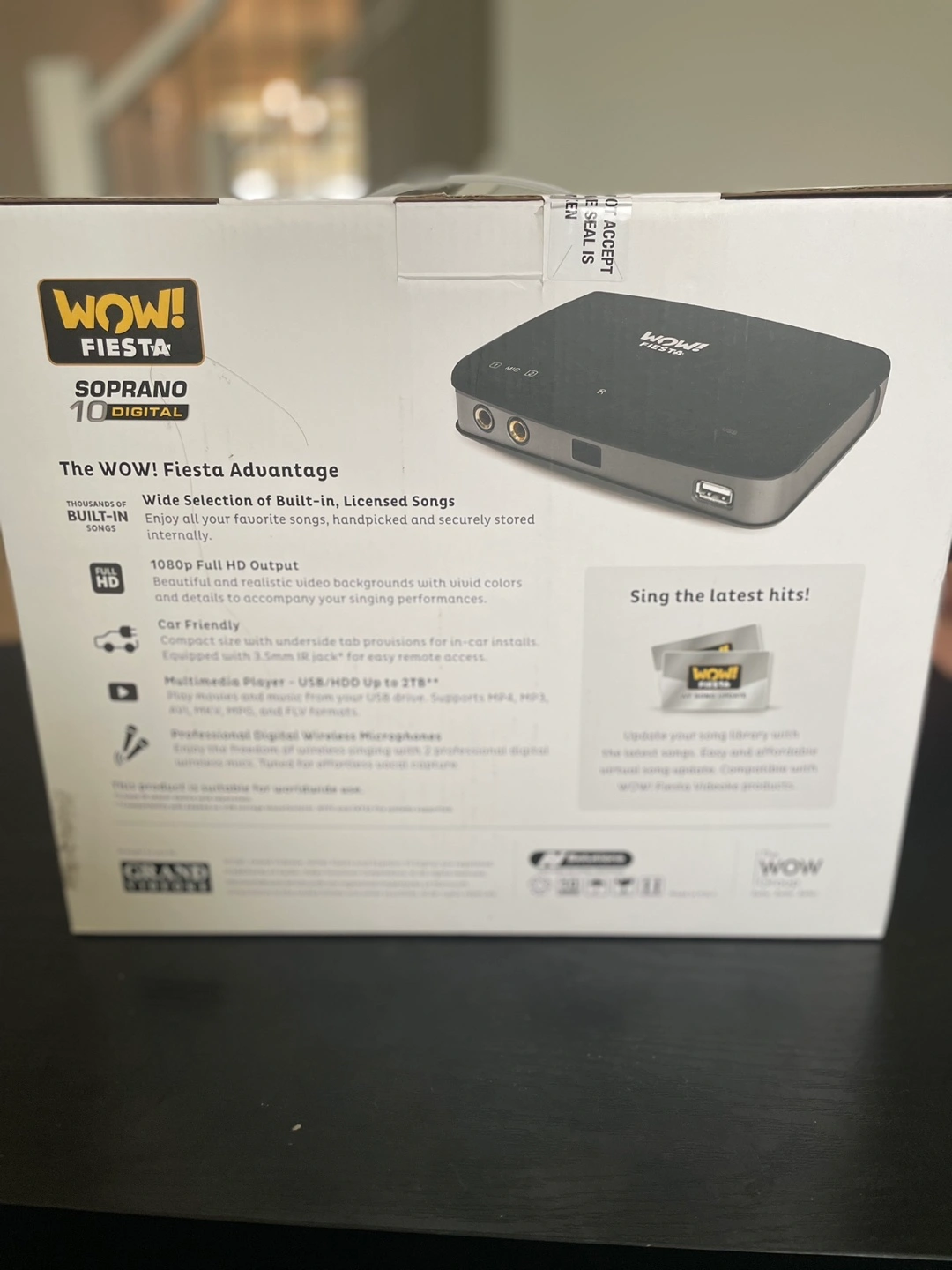 Karaoke machine with two microphones and carrying case. Includes a variety of built-in songs. 1080p Full HD output. USB/HDD up to 32 GB. Car friendly.
