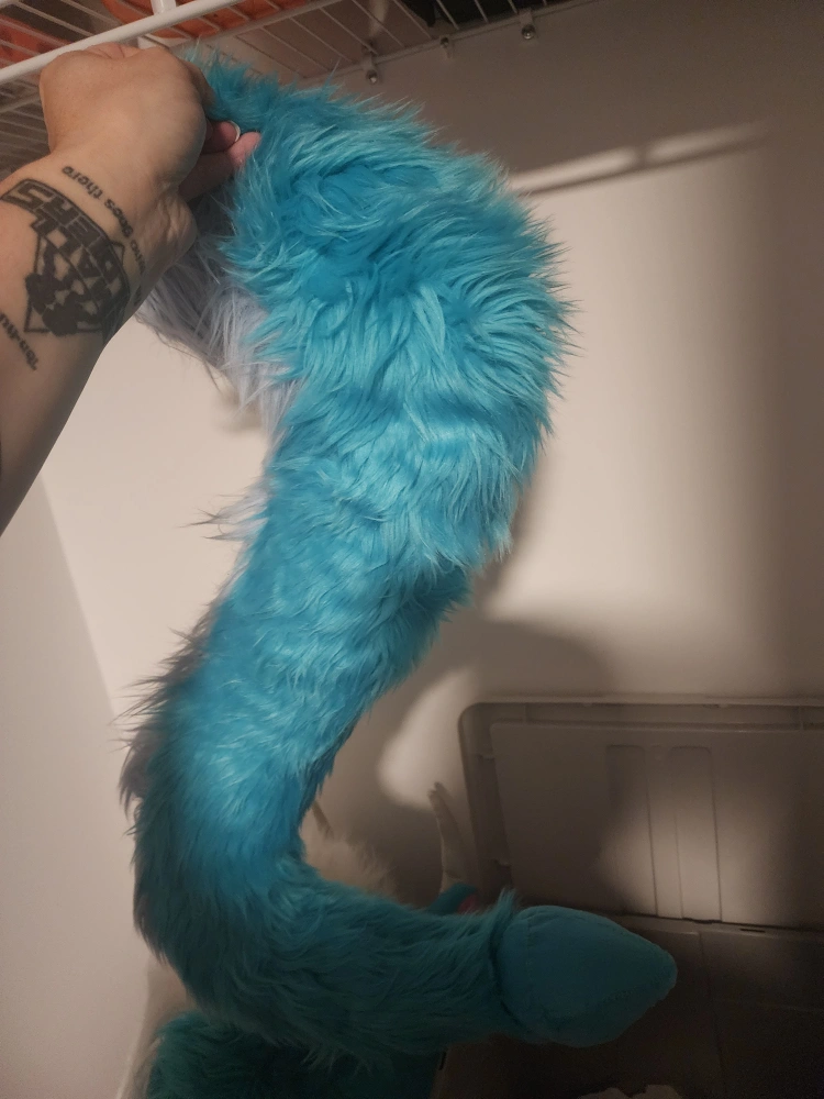 Blue dragon fursuit partial, includes head, tail, and hands and a small fan. It also comes with art pieces and a reference sheet.