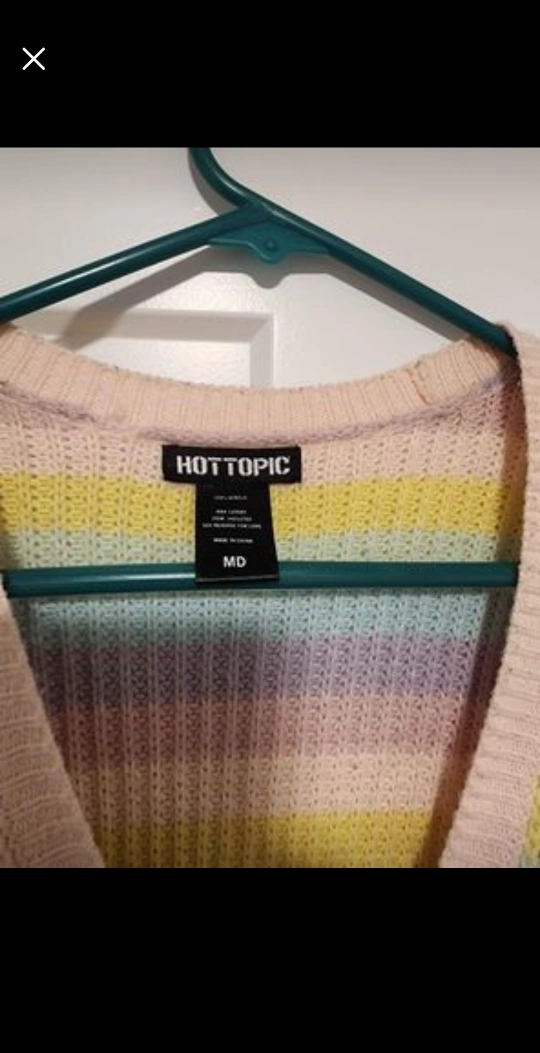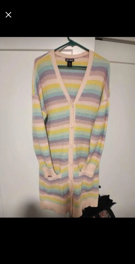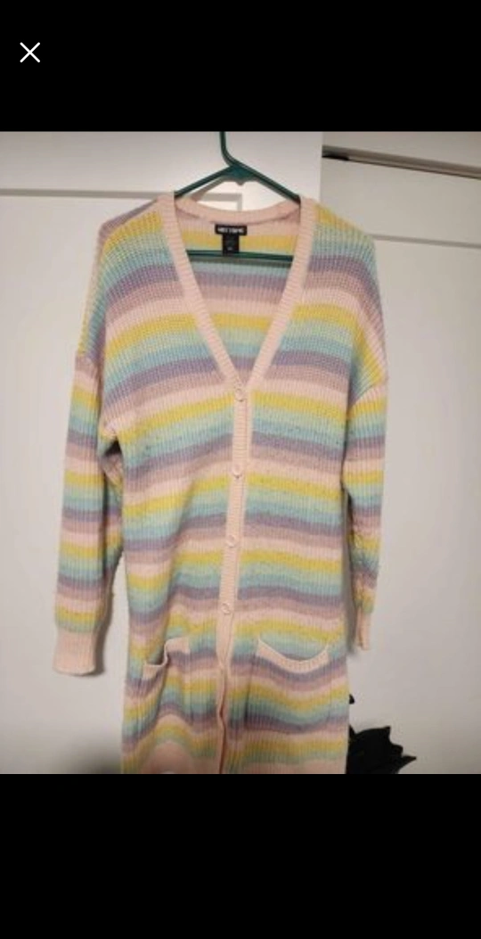 Long-sleeved cardigan with rainbow stripes and a V-neck. Features front pockets and button closure.