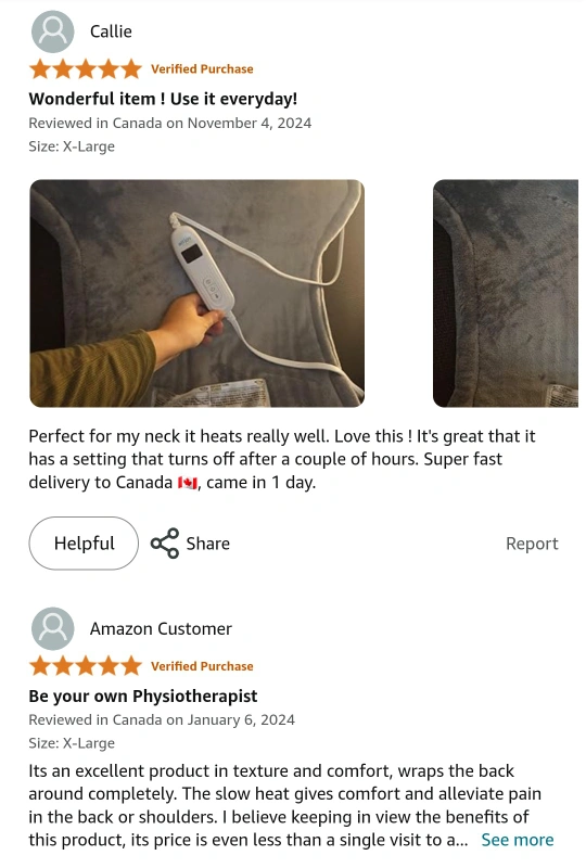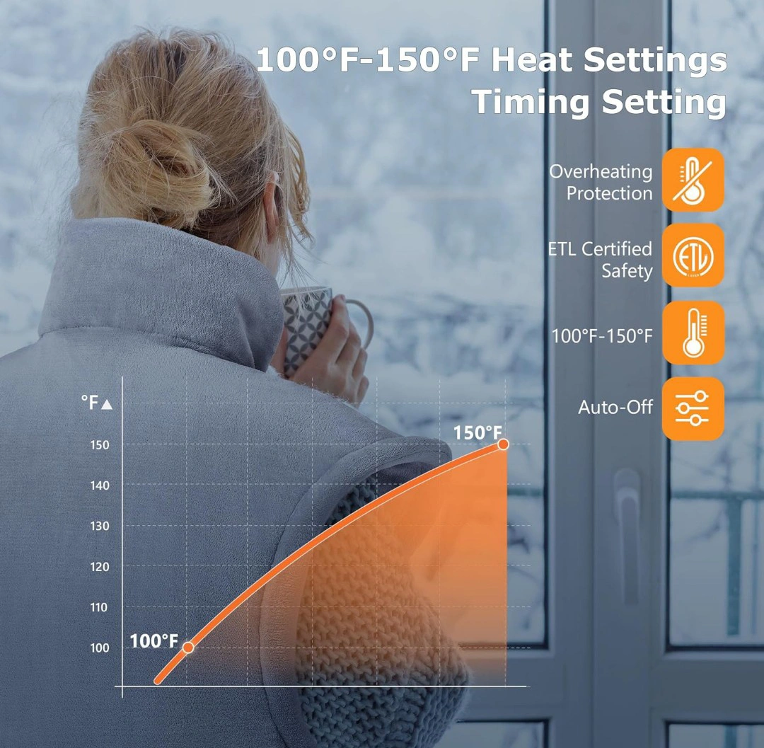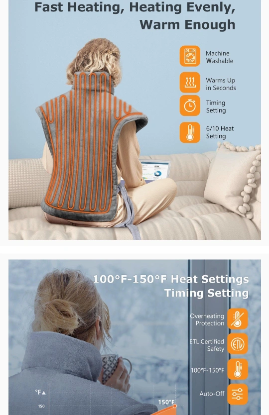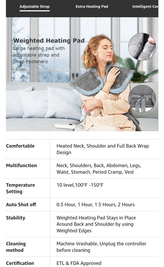 Large heating pad with adjustable strap and snap fasteners. Heated neck, shoulder and full back wrap design. Neck, shoulders, back, abdomen, legs, waist, stomach, period cramp, vest. 10 level, 100°F - 150°F. 0.5 Hour, 1 Hour, 1.5 Hours, 2 Hours. Around Back and Shoulders Stays in Place Weighted Edges. Machine Washable. Unplug the controller before cleaning. ETL & FDA Approved.