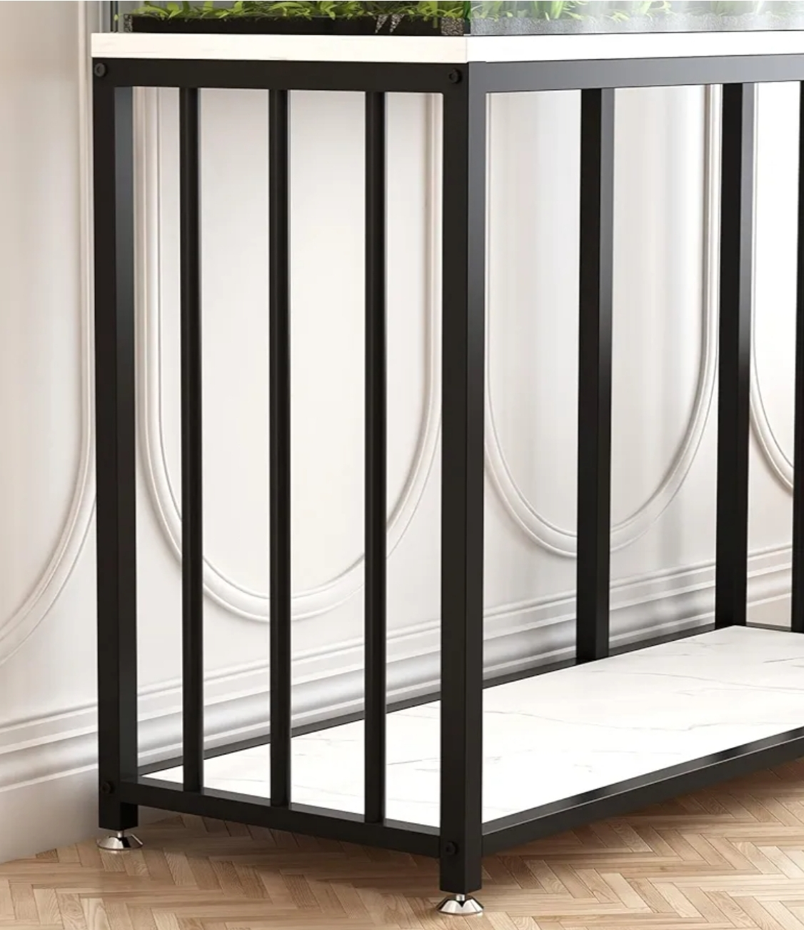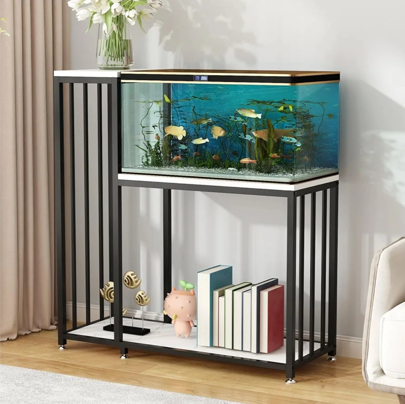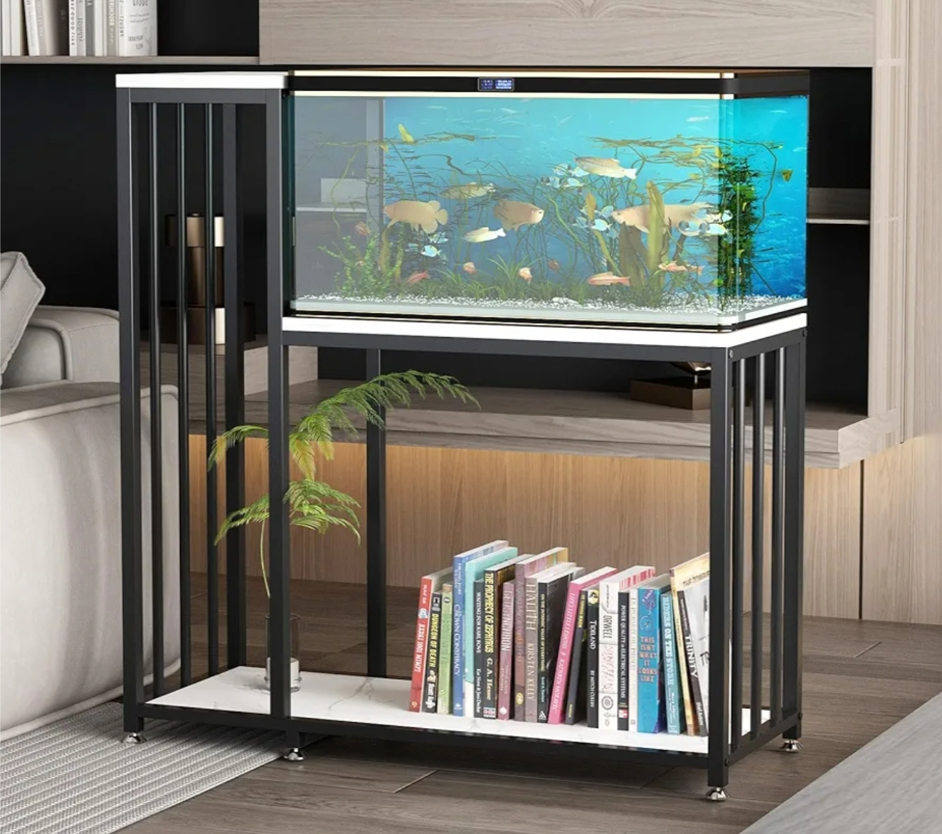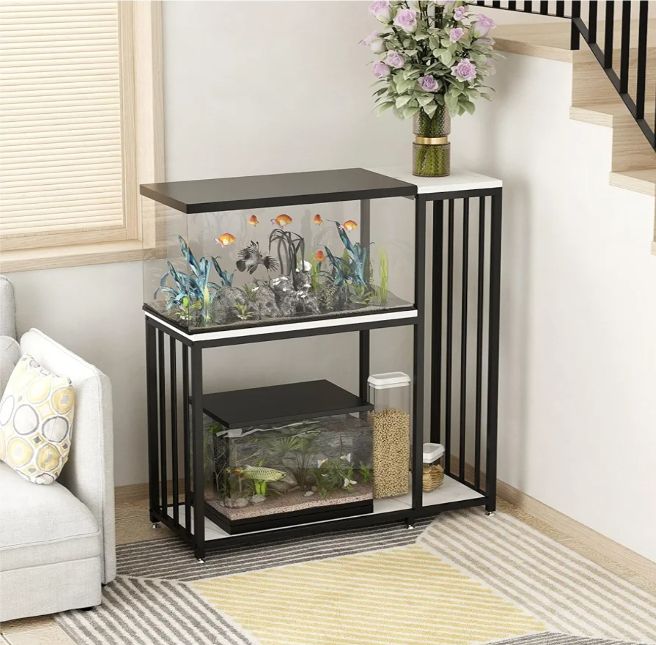 2 in 1 Space-Saving: This modern aquarium stand offers a 2-in-1 solution for both decorating and storage. The top shelf can place 29 gallon fish tank, and the bottom and side shelves are convenient for you to place plants, photos, store fish feed, fish nets, gravel cleaner, water conditioner, and other items.