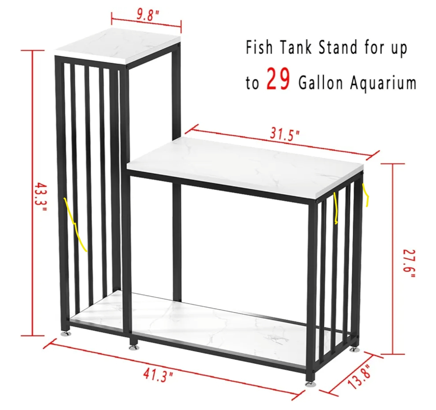 Fish Tank Dimensions: Fish stand fits up to 29 gallon tanks up to with a measurement 31.5" long and up to 13.8" wide. The weight capacity of top and bottom shelf can hold up to 330 pounds, can ensure the safety and stability of your aquarium setup.