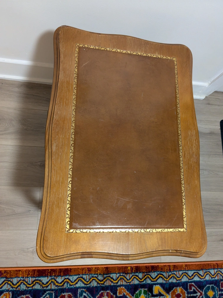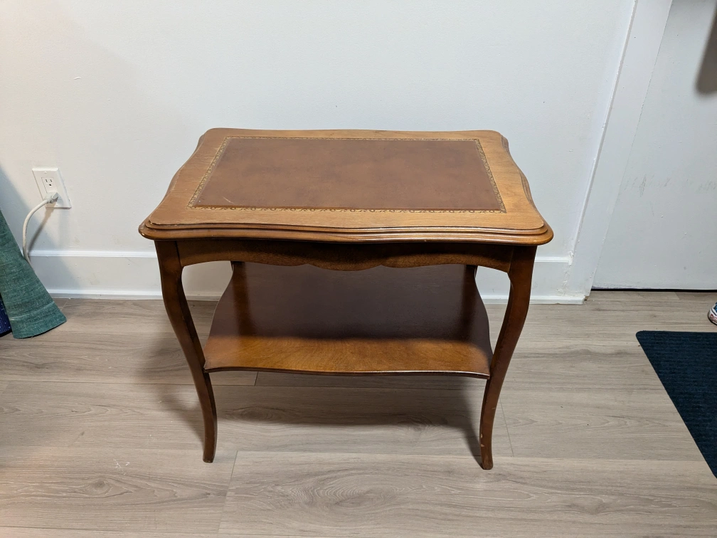 solid wood side table with lower shelf. Curved legs and a decorative border around the top. in good condition with some knicks and wear over time. I've enjoyed the character and warmth of this piece!