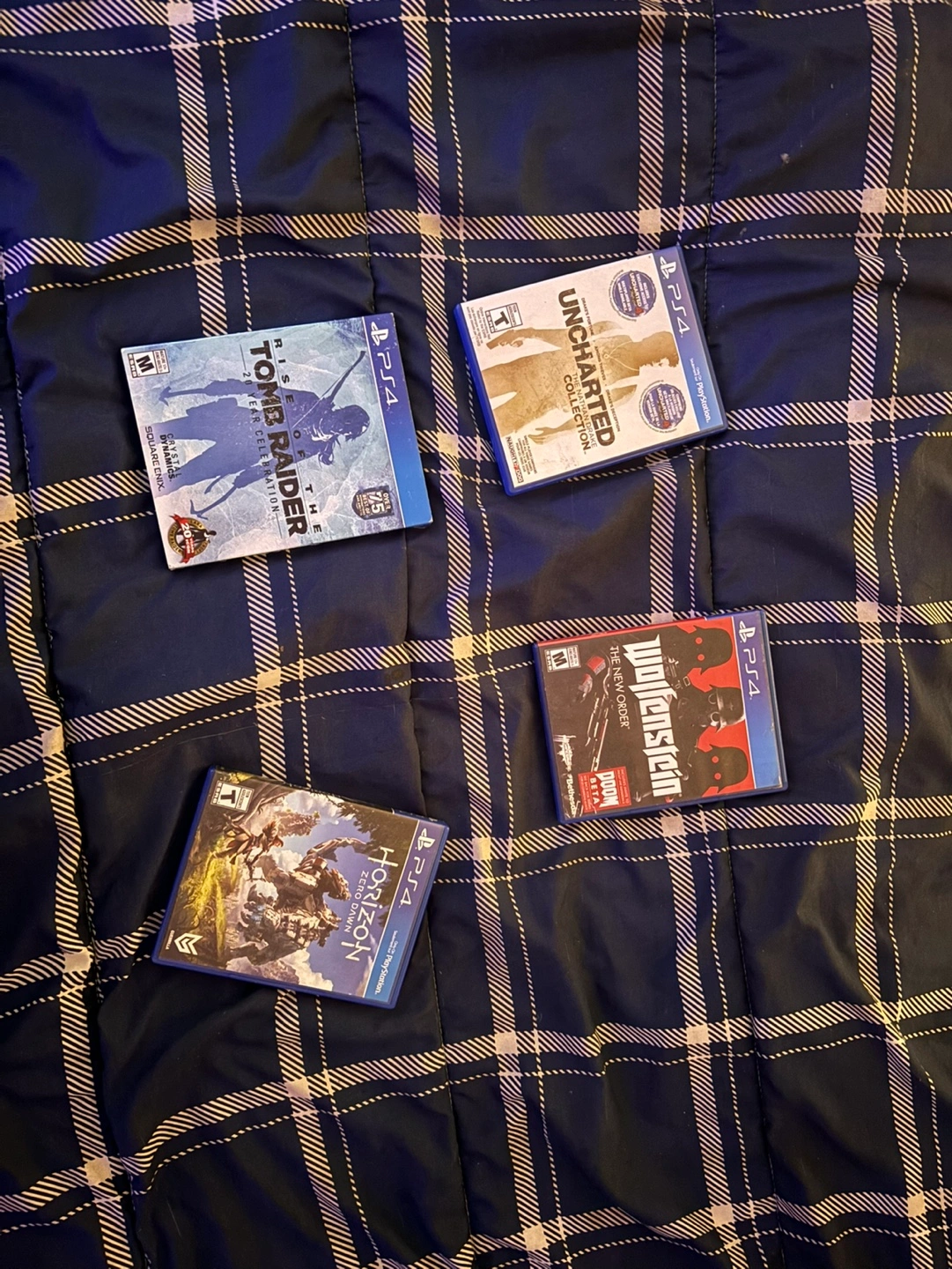 PlayStation 4 console with 4 games: Uncharted: The Nathan Drake Collection, Horizon Zero Dawn, Wolfenstein: The New Order and Laura Croft: Rise of the Tomb Raider. Comes with one controller. All cables and instructions included.