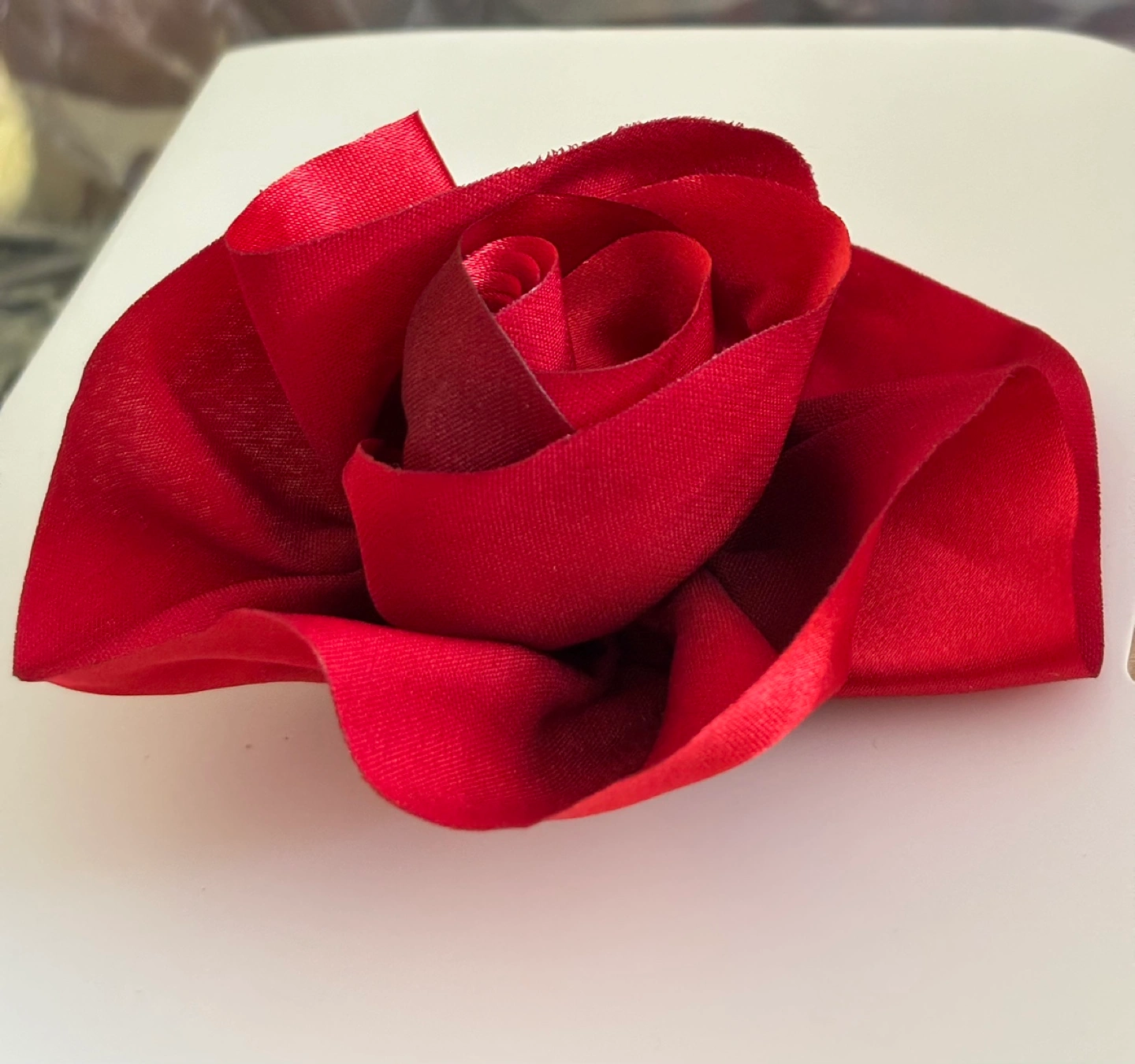 Red satin rose brooch with a pin backing. Perfect for adding a touch of elegance to any outfit.