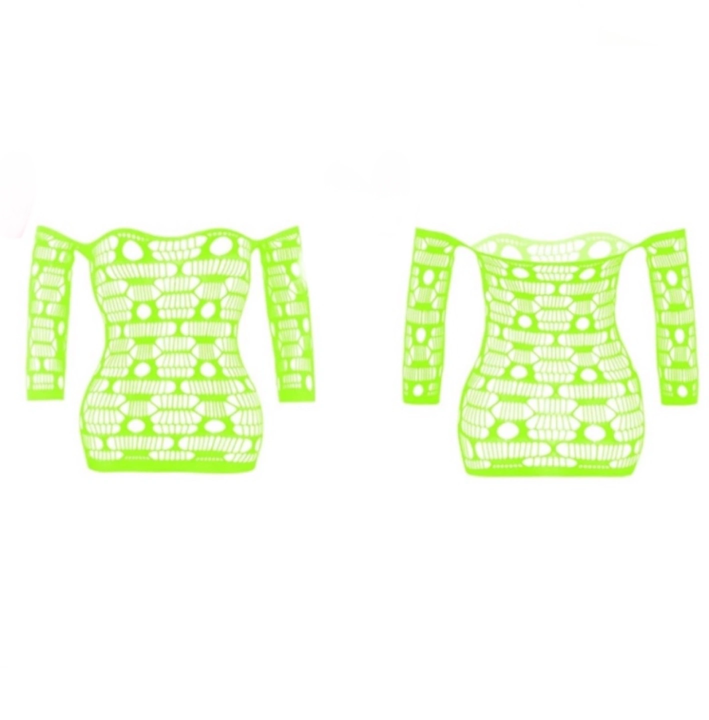 Green mesh off-the-shoulder dress with long sleeves. It has a geometric pattern. Brand new! 🆕 One size fits all/most (XXS to XXL suggested)