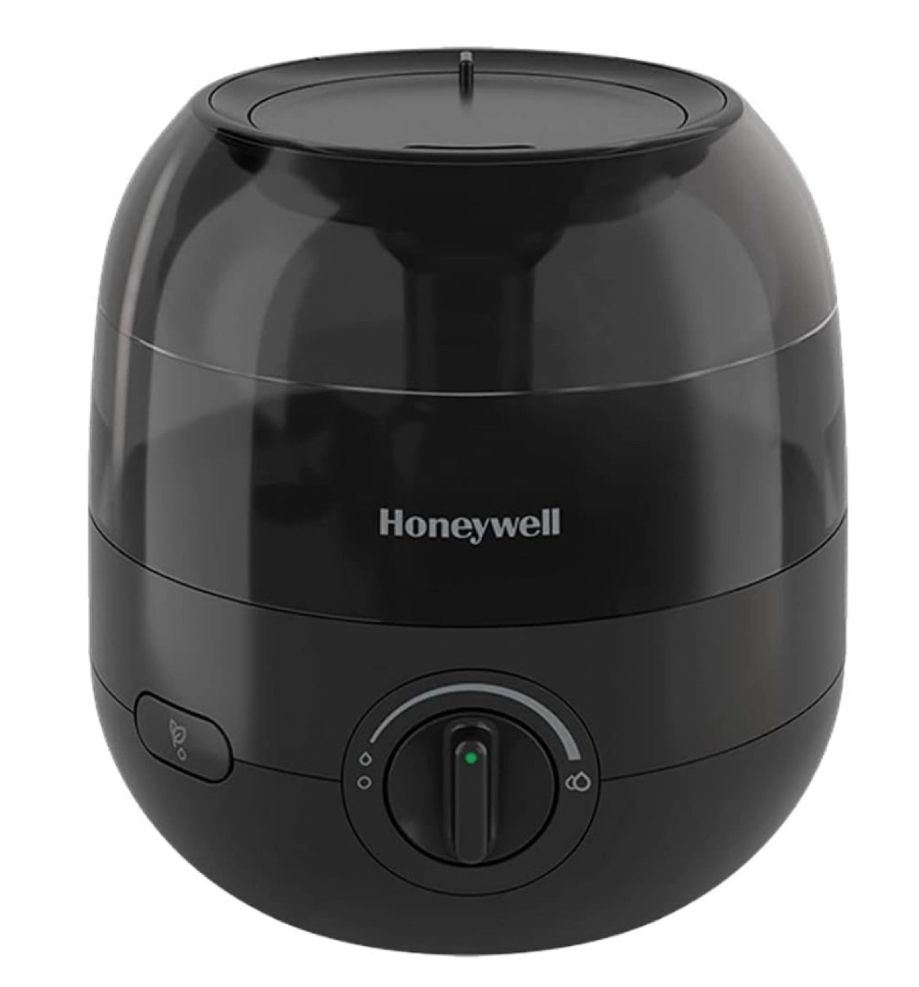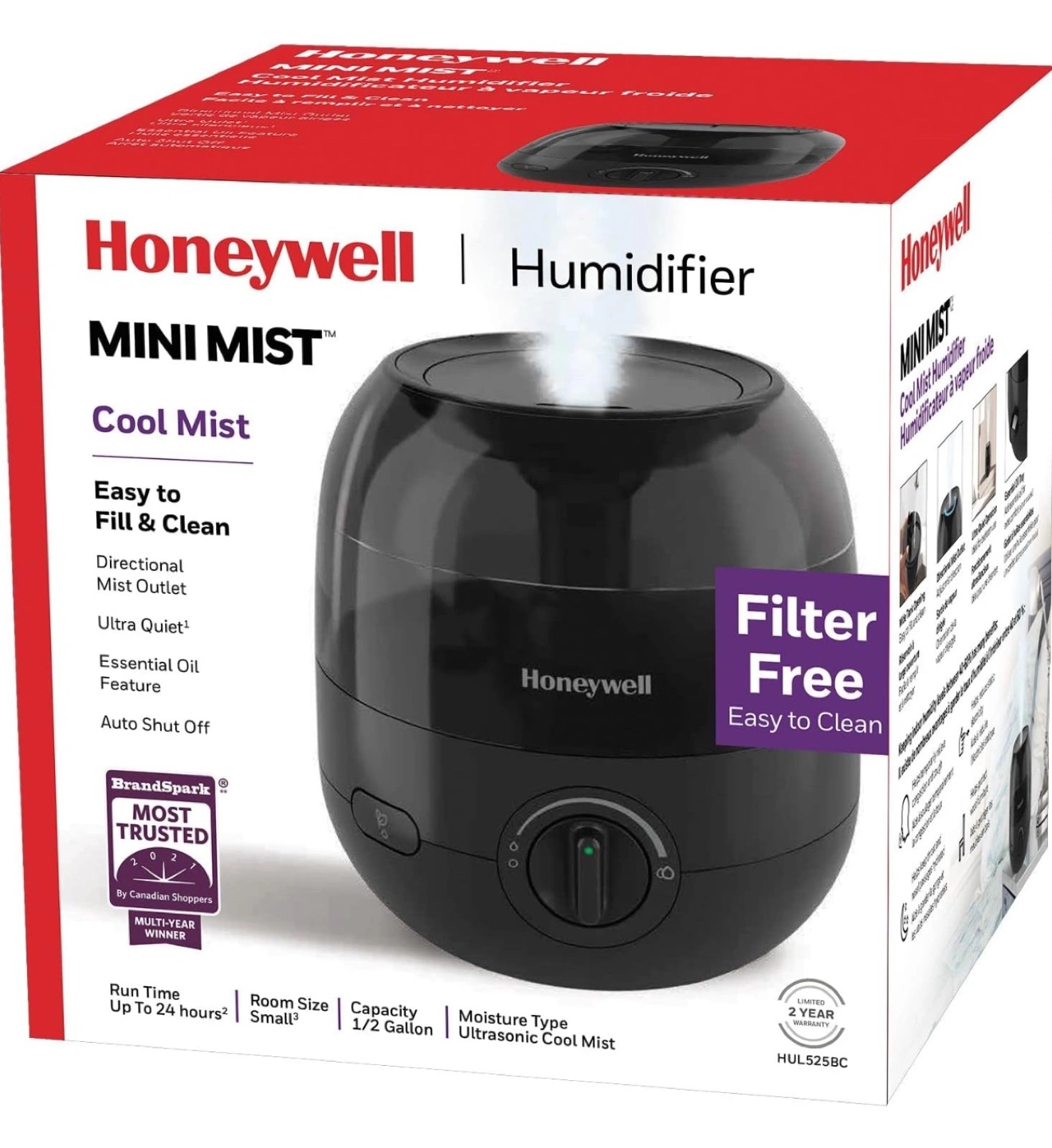 Small humidifier. Includes filter. Directional mist outlet. Ultra-quiet. Essential oil tray