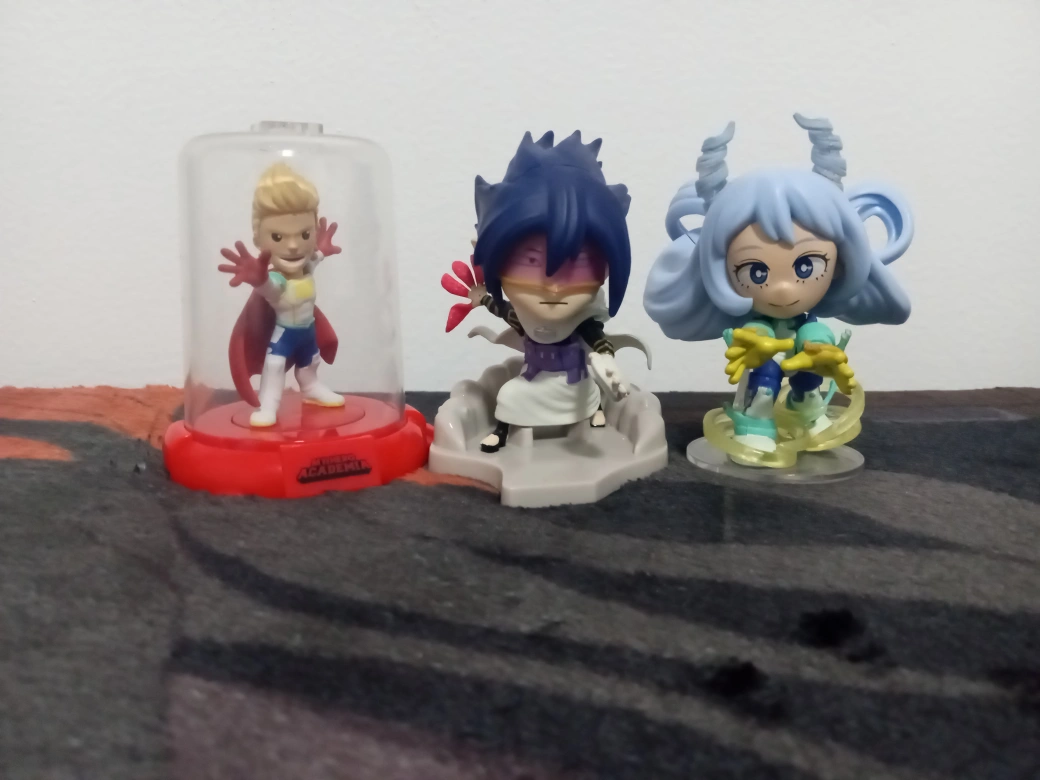 Set of three My Hero Academia figures. All figures stand on a base. One figure comes in a plastic dome. mirko togata, tamaki amagiki, nejire hado