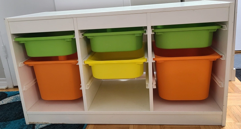 only storage no bins. Please look at the pictures to get an idea of the condition. Bought it in this condition from Facebook marketplace and have been using it with no problems, however we no longer need it. It seems to be some water damage and discolouration mostly on the back and one side. It does not affect the functionality of it. Main intersection for pickup Donmills & St. Dennis. Serious inquiries only please. Fastest pickup preferred.
