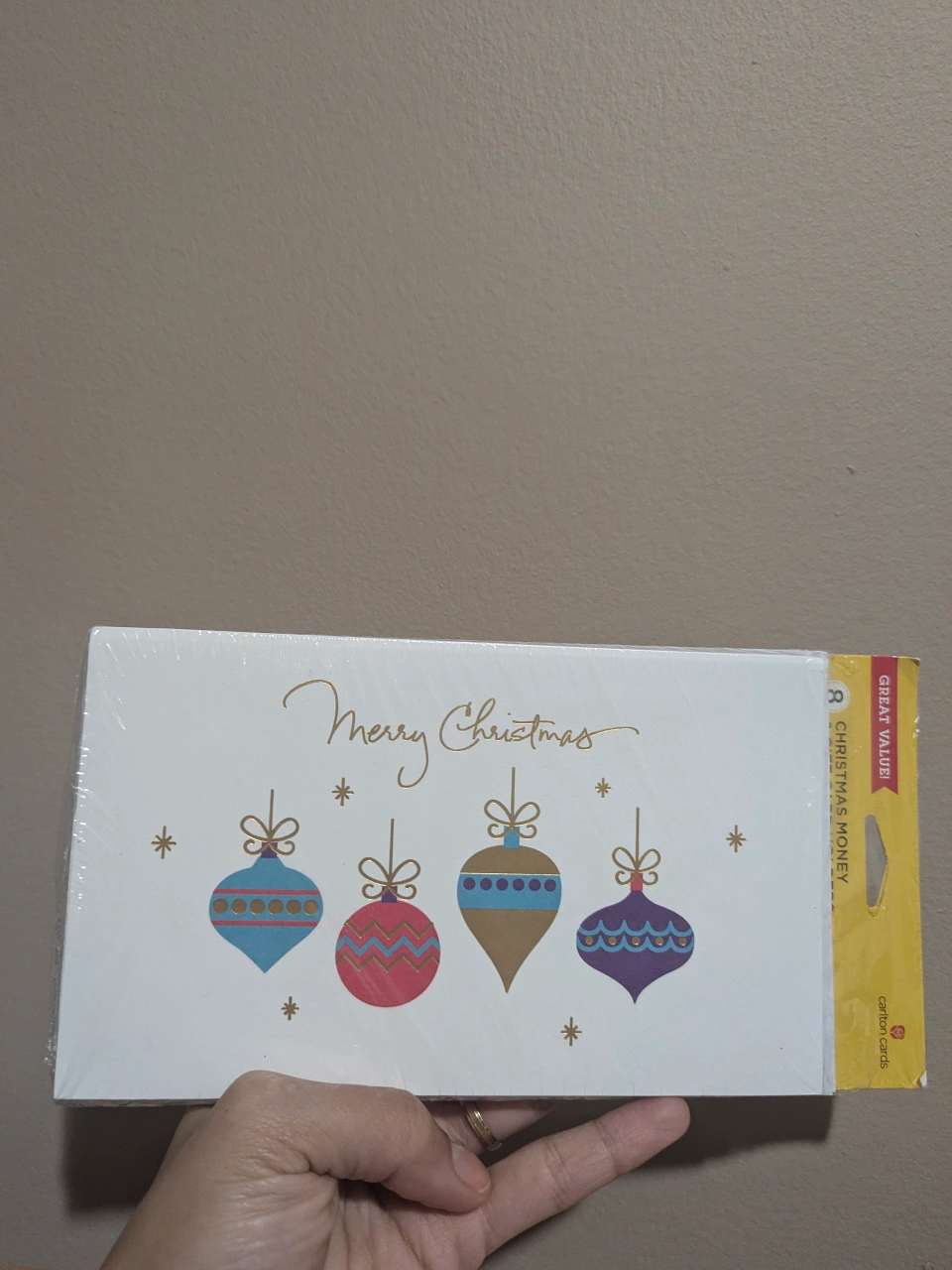 Pack of 8 Christmas cards with envelopes. Features ornaments with a gold design. The inside reads: "Wishing you peace and joy to fill your holiday, your heart, your year."