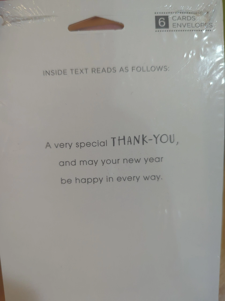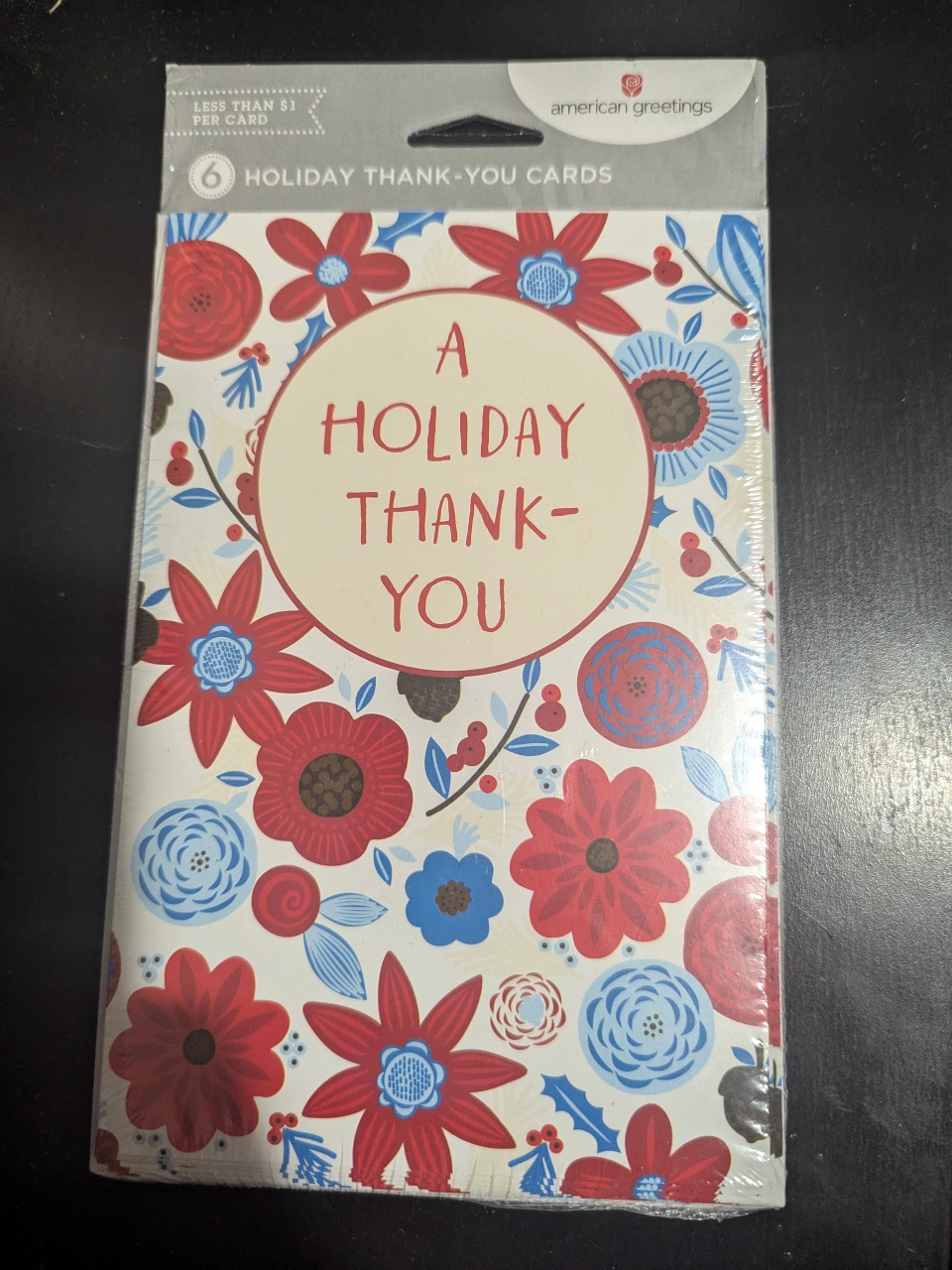 Pack of six holiday thank you cards with envelopes. Features a floral design and the message 'A Holiday Thank You'. Inside text reads: 'A very special THANK-YOU, and may your new year be happy in every way.'