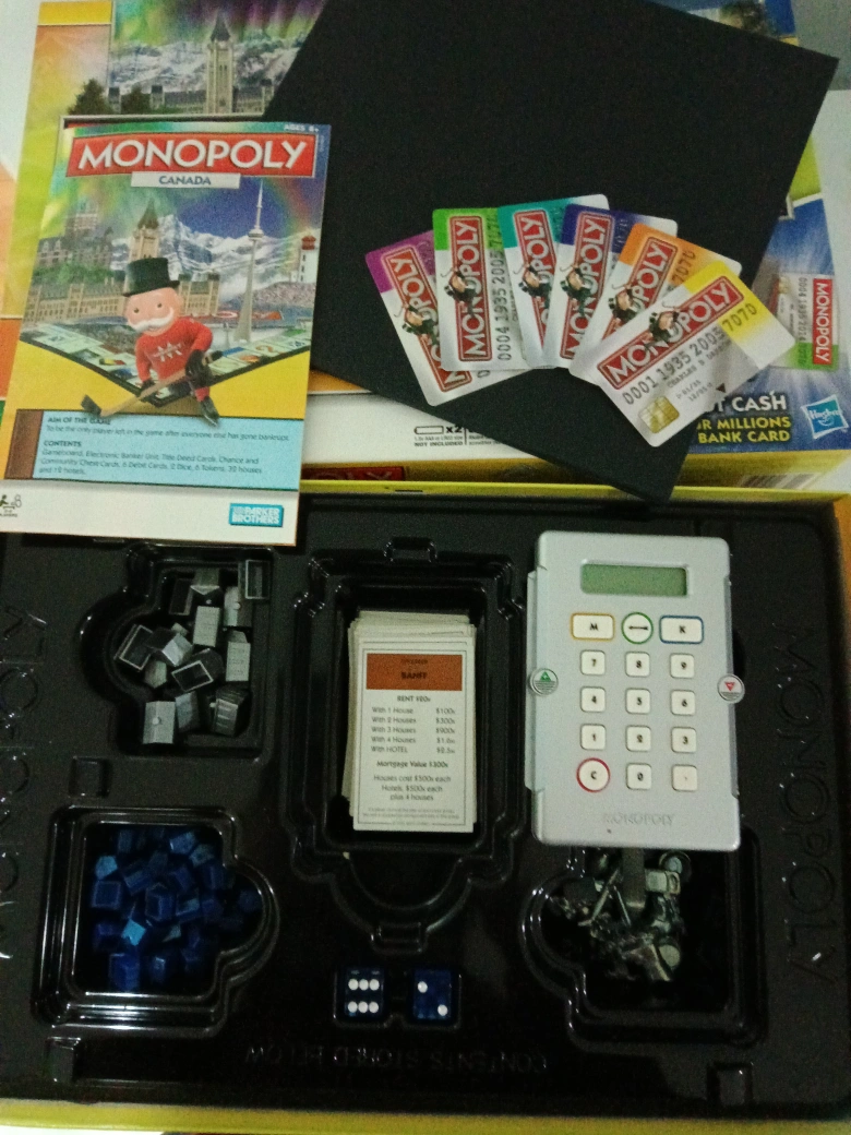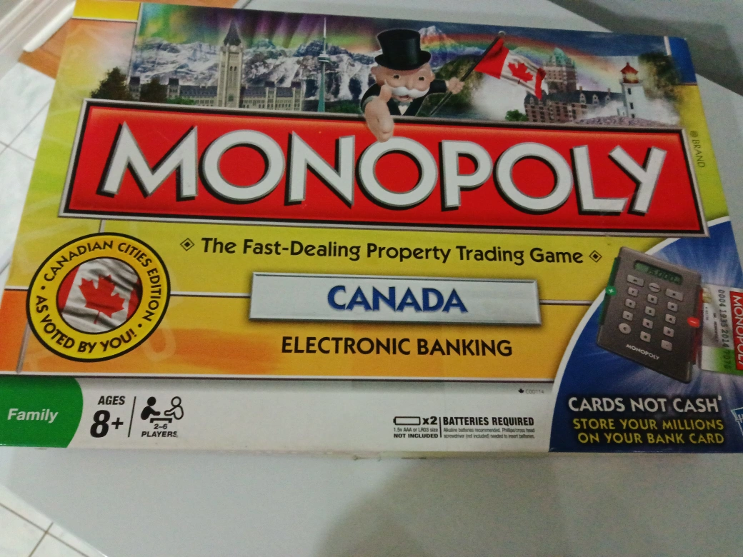 Canadian Cities Edition, includes electronic banking unit, game pieces, cards, and money. For 2-6 players. Ages 8+
