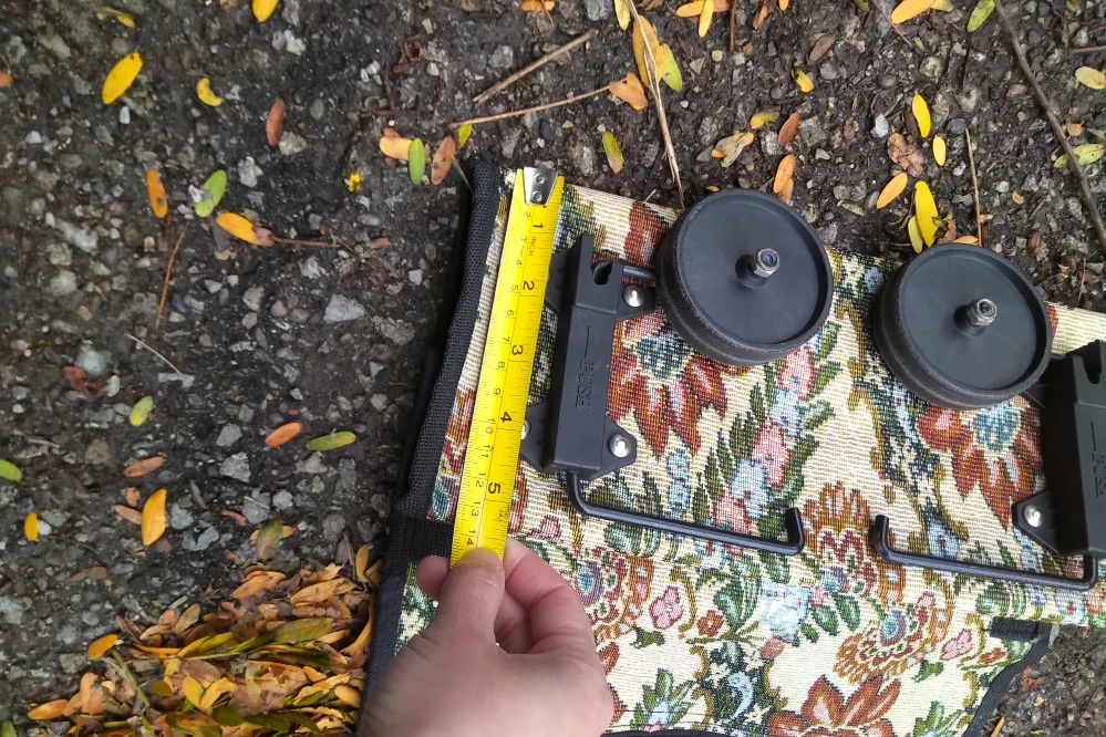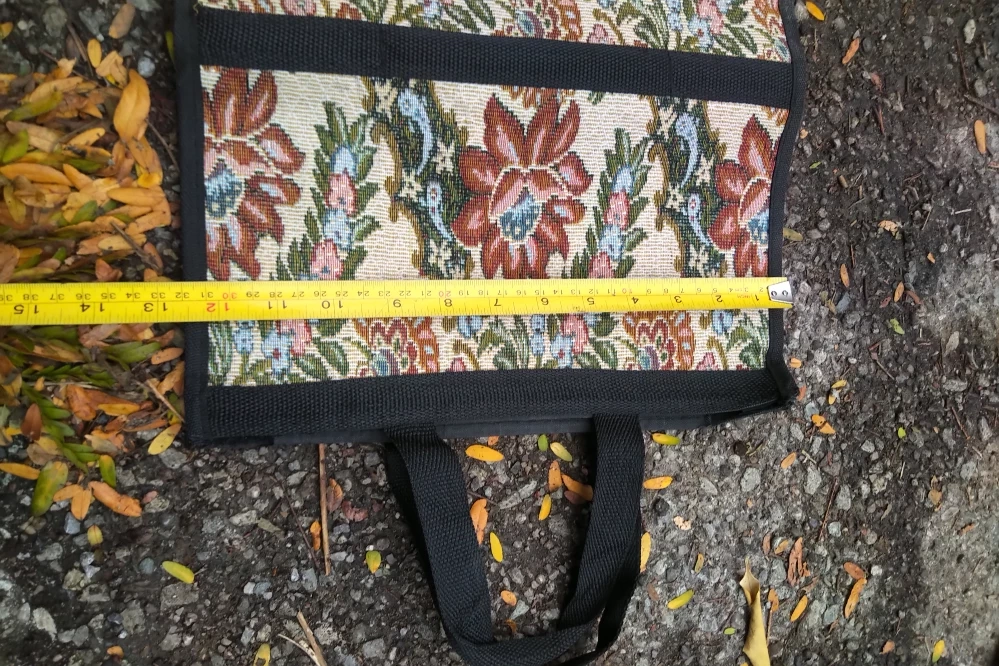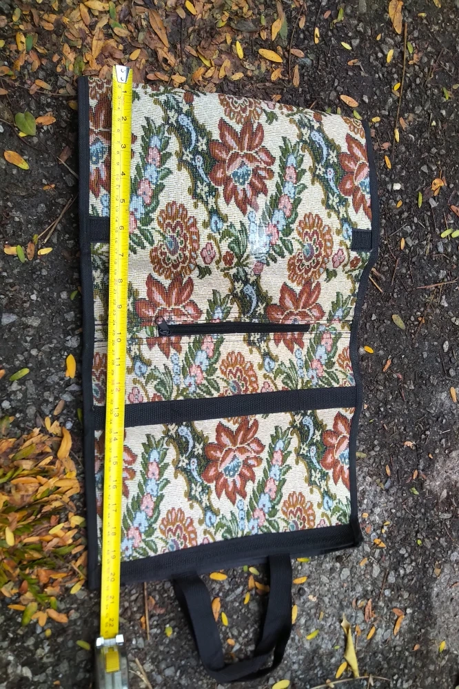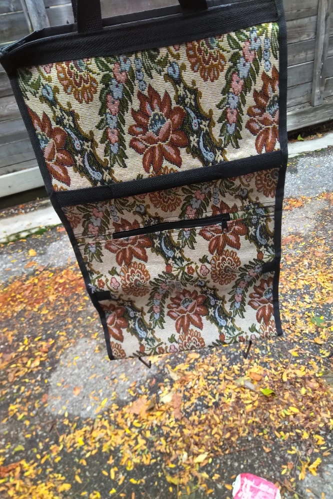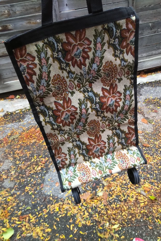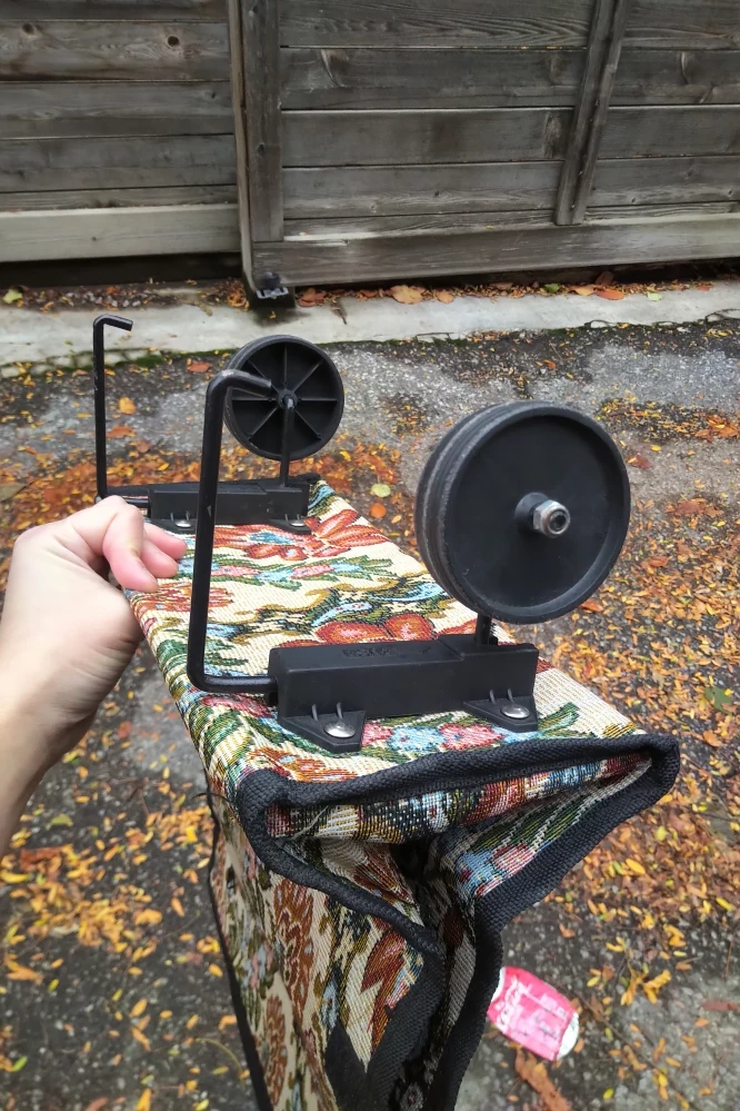 folds up for storage (into thirds), has handles. the wheels fold in for storage - push in and flip out also has a zip pocket on the outside can meet in Trinity Bellwoods Or Bloor/Yonge select days/times