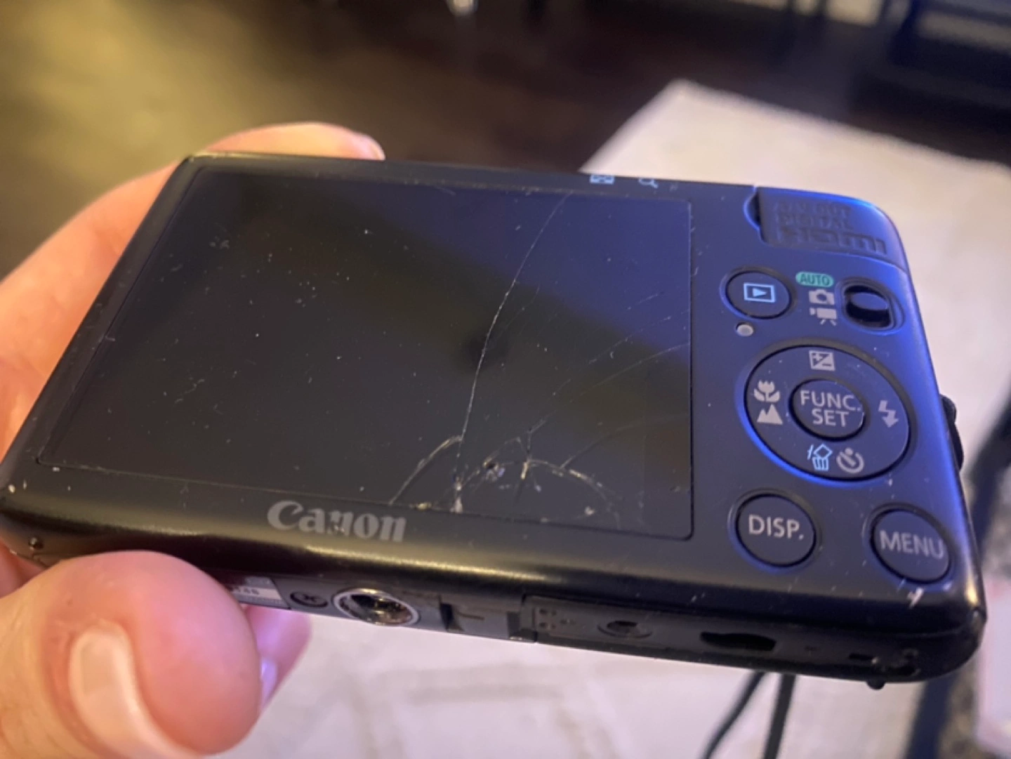 Digital camera with charger, original carrying case, 4gb SD card. LCD screen has cracks. Otherwise, function normally. Great camera, takes great quality pics, videos, and has fun effects.