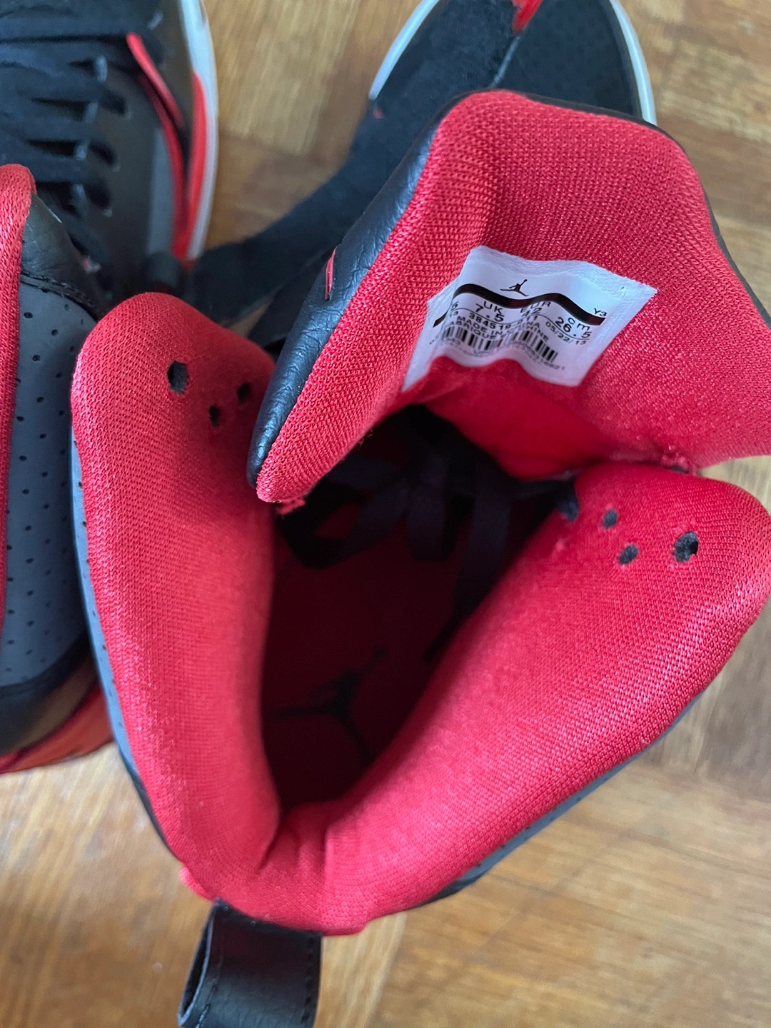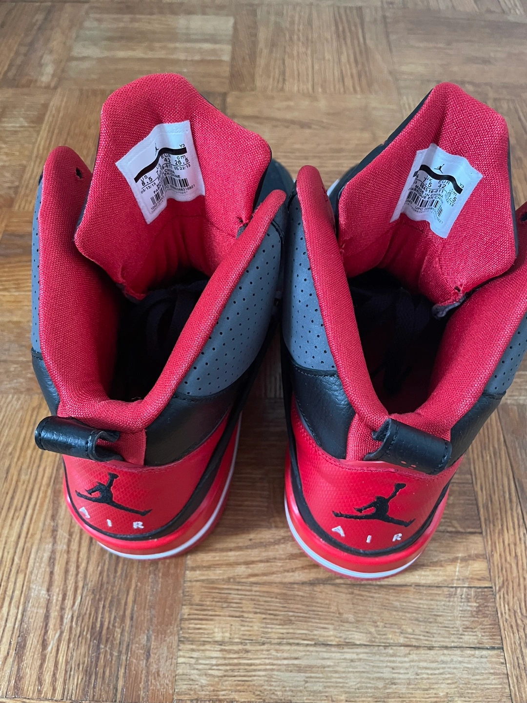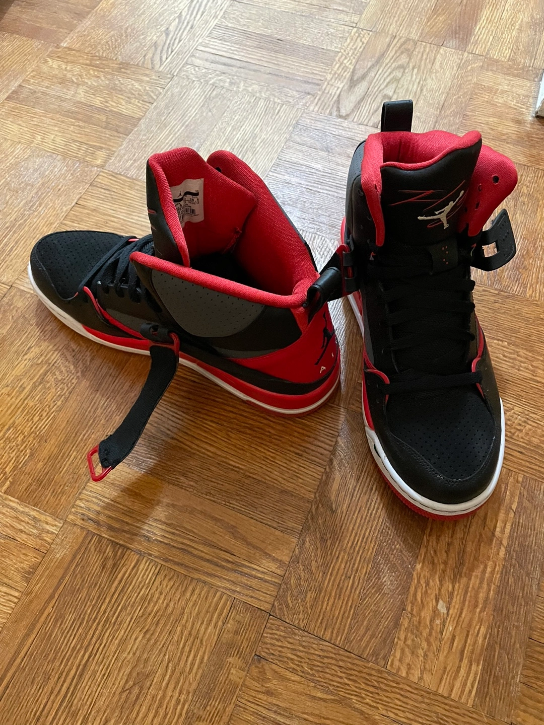 Black and red high top sneakers, size 8.5Y. Velcro straps. Excellent near mint condition.