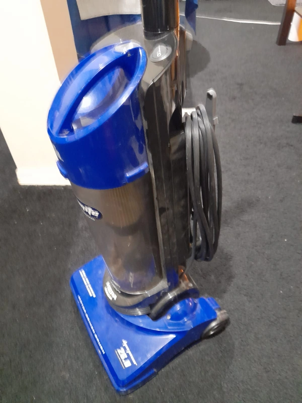 Blue and black upright vacuum cleaner. Has a motor-driven brush and a clear dust cup.