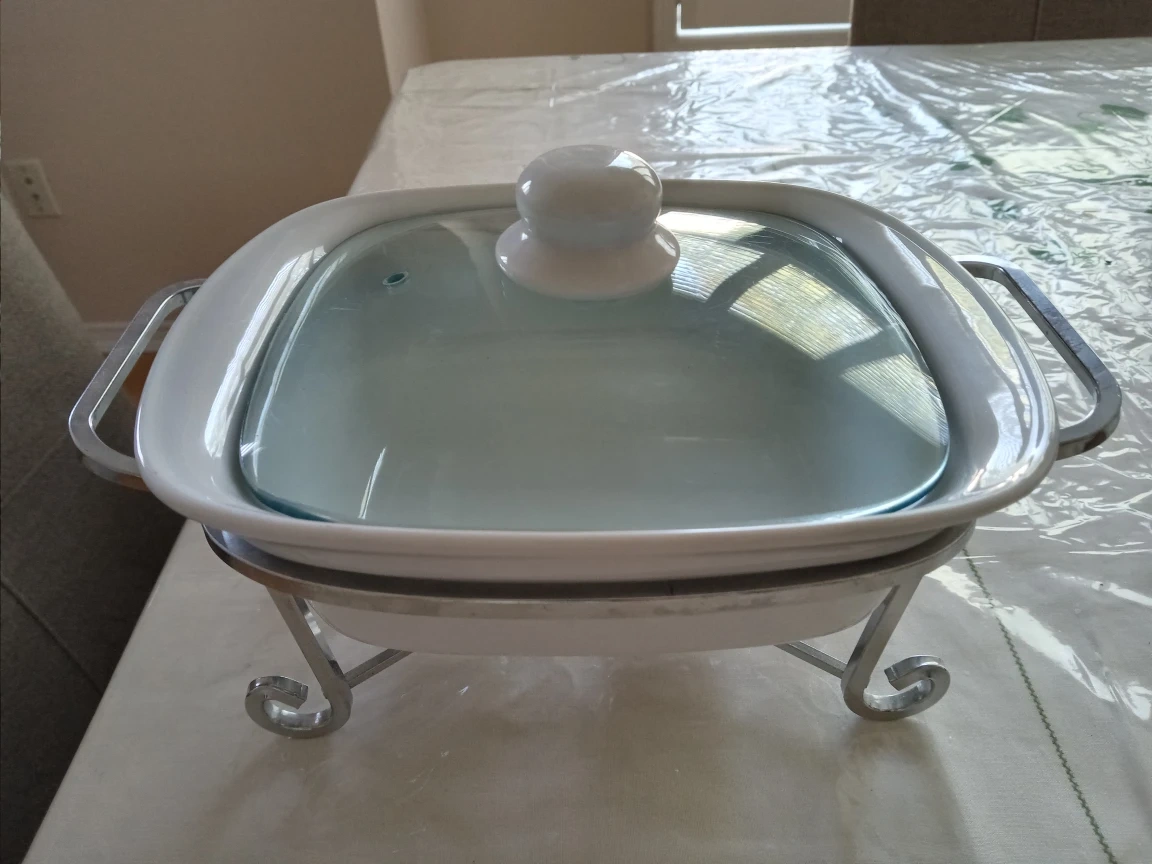 Square ceramic dish with warmer stand. The dish has a glass lid in perfect condition. warmer stand is never used bit only the dish is used once only for a very less time to check.size 7 by 7 inches square. pick up only.