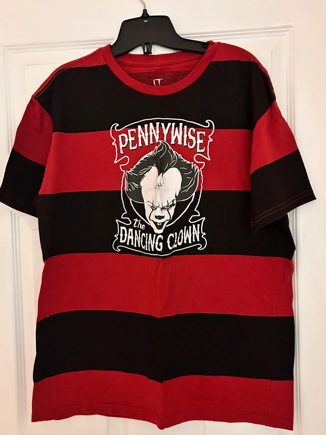 321Red and black striped t-shirt featuring Pennywise the Dancing Clown. Large size.