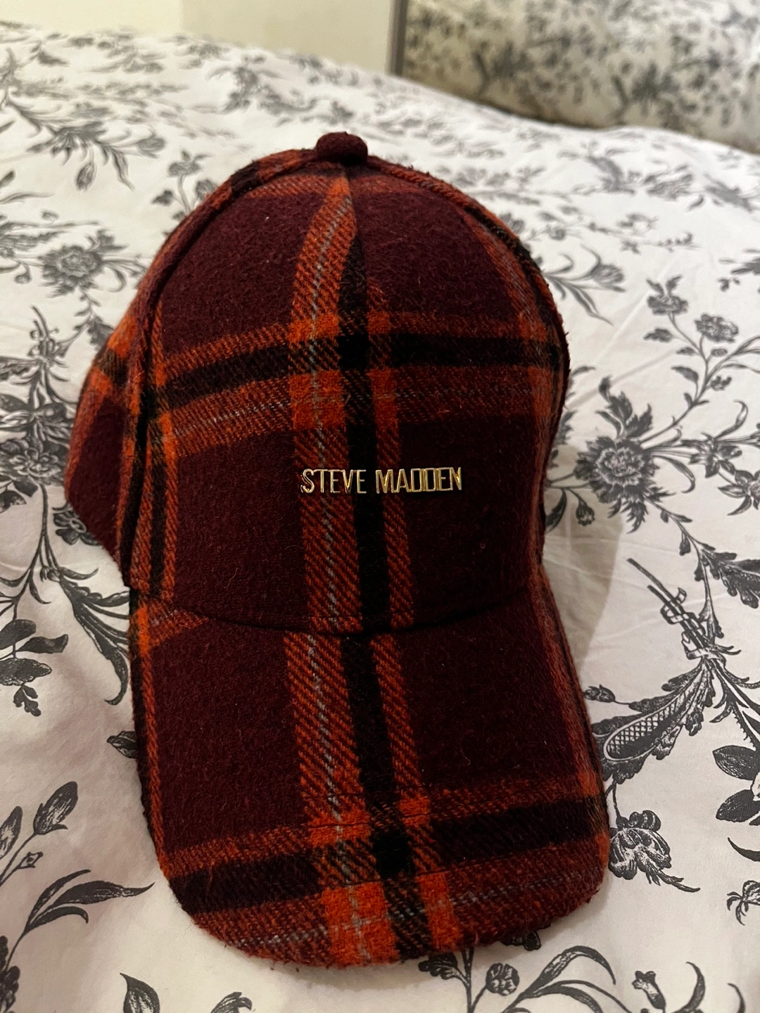 Steve Madden Red and black plaid baseball cap with gold logo.