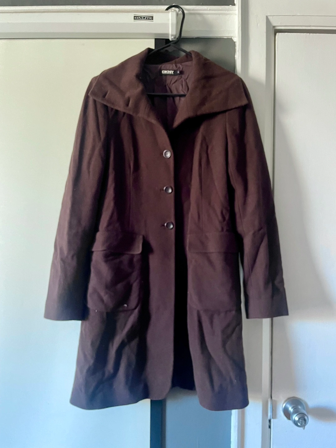 Beautiful stylish wool or wool blend coat: 3 button closure, collar neck (with buttons that go all the way up on collar). Color is a very dark plum-brown. Last photo is not the exact same coat but gives you an idea of how it looks on the body. Received as gift, worn lightly. Pick up at Church / Wellesley Check out my other items! Happy to bundle 🛍️ Cash only.