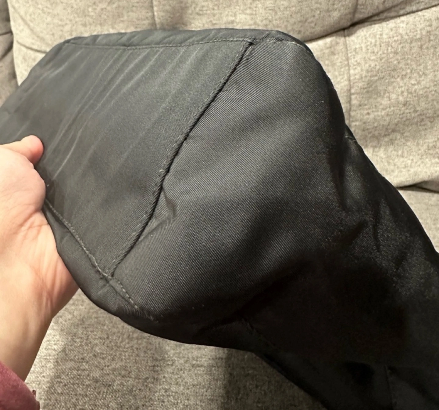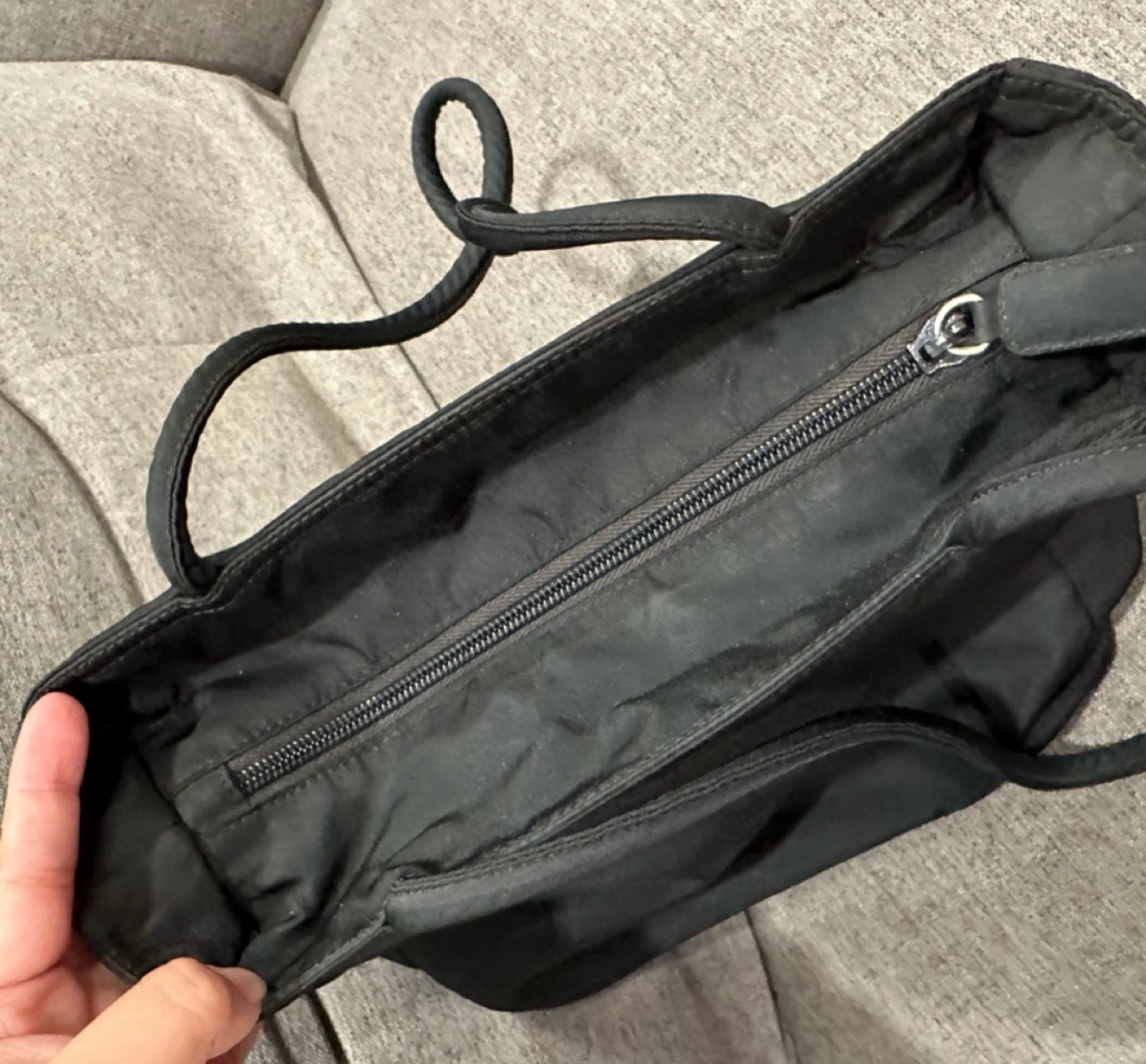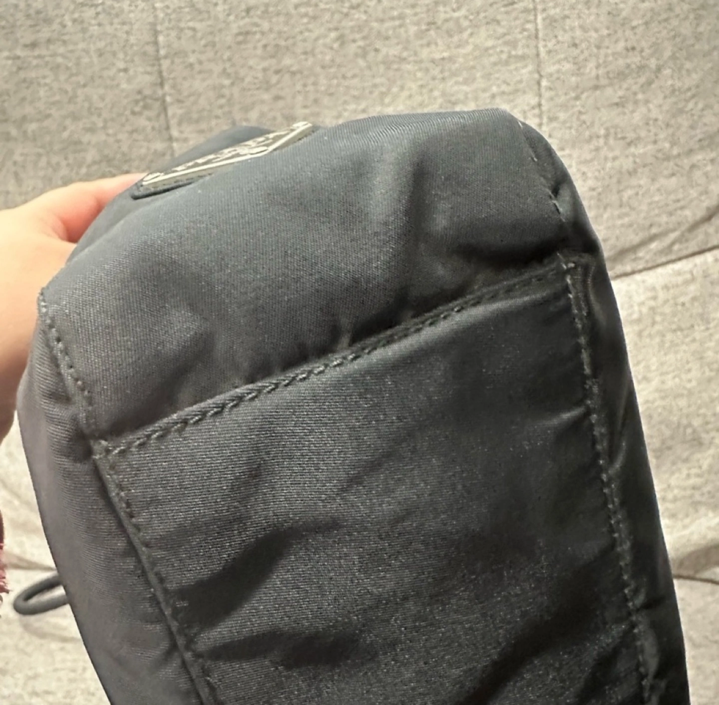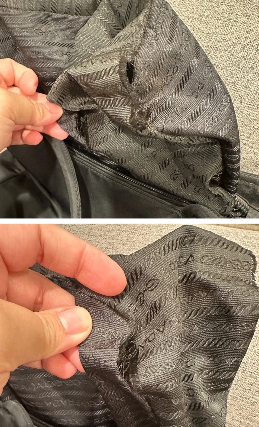 No major flaws to mention on the exterior part of the bag. Only minimal signs of use. The other side has a pocket with velcro snap closure. The velcro snap came off a little bit but still intact. A glue might help to fix it. The shoulder strap is in great condition. The zipper runs smoothly.