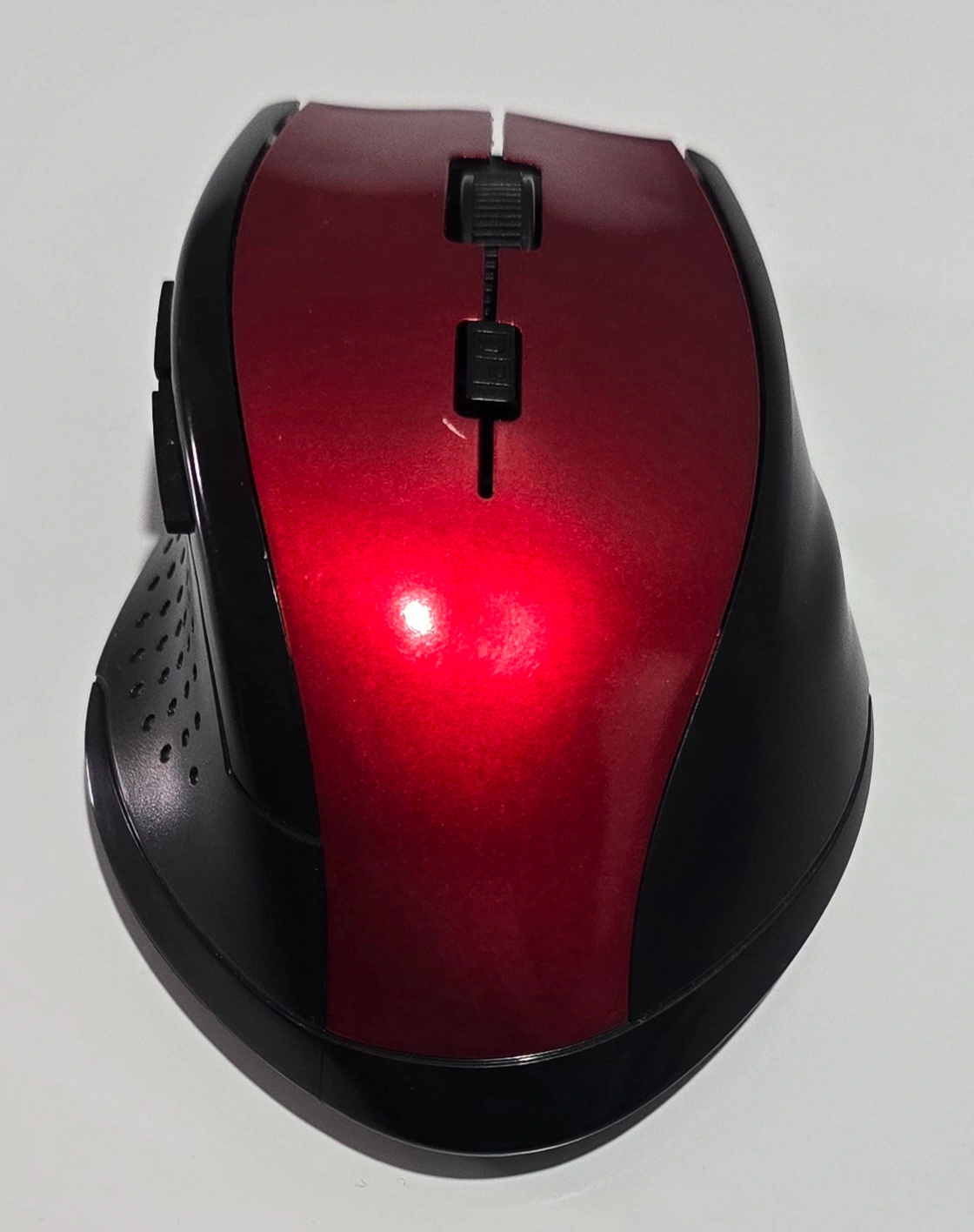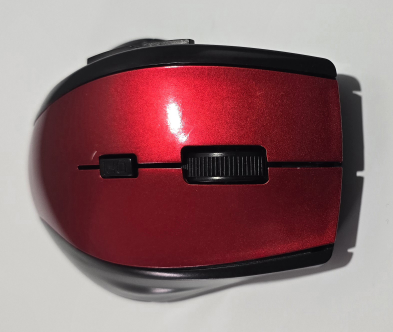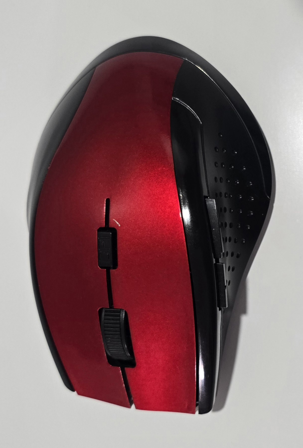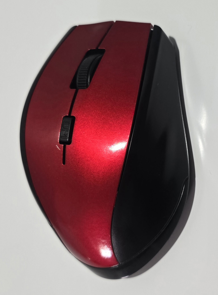 Red and black wireless mouse. Includes a scroll wheel, DPI button, and two side buttons. Comes with a USB receiver.