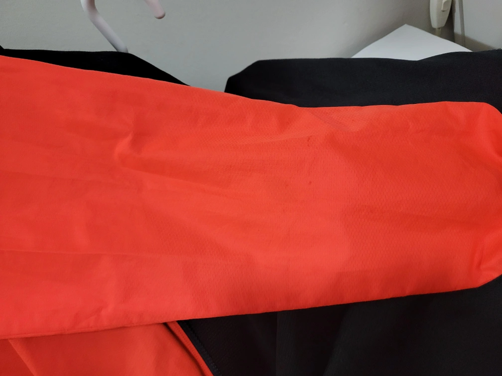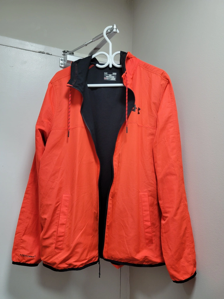 Men's Under Armour jacket. Orange with black accents and zipper closure. Has a hood. Some spots on the sleeve.
