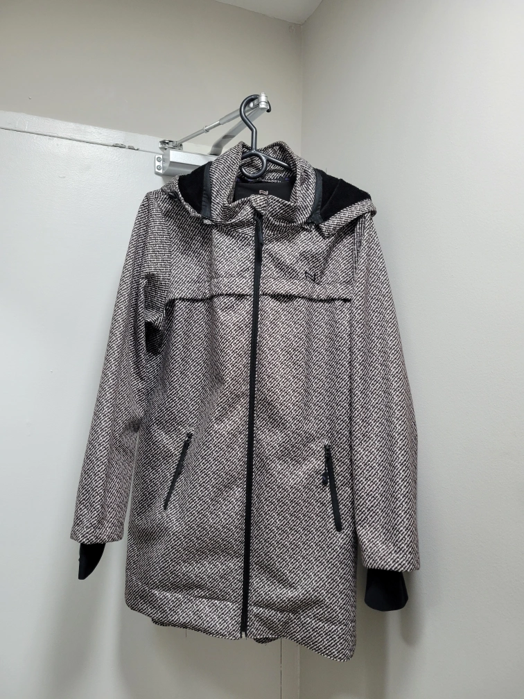 Black and white patterned coat with a fleece lining and a hood. The coat is zip-up with two pockets on the front. The sleeves have ribbed cuffs.