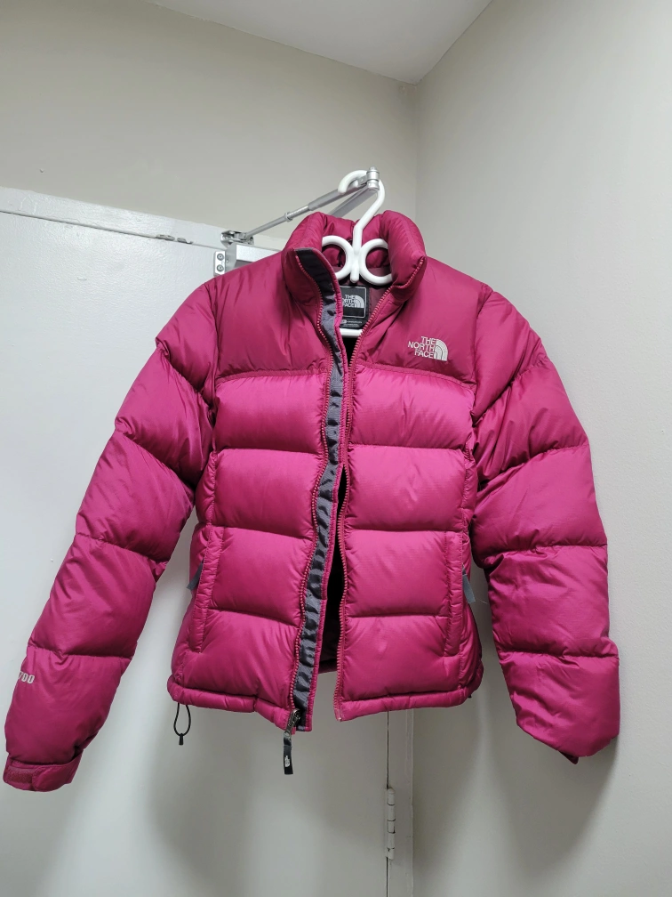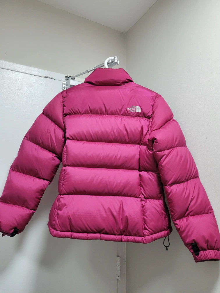 Pink puffer jacket with a zipper closure. Has two pockets on the front and an internal pocket on the left side.