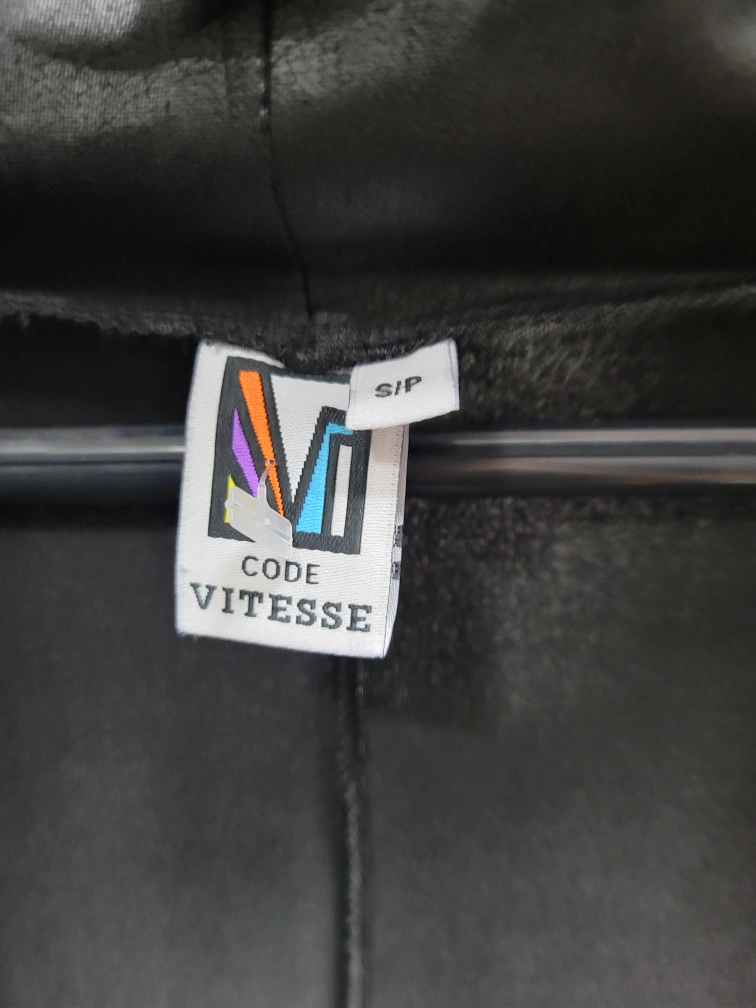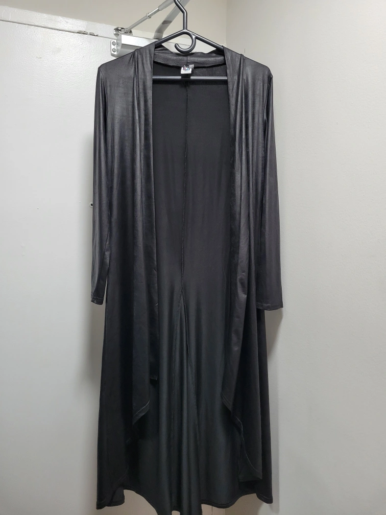 Long black faux leather cardigan. Open front with long sleeves. Asymmetrical hem.