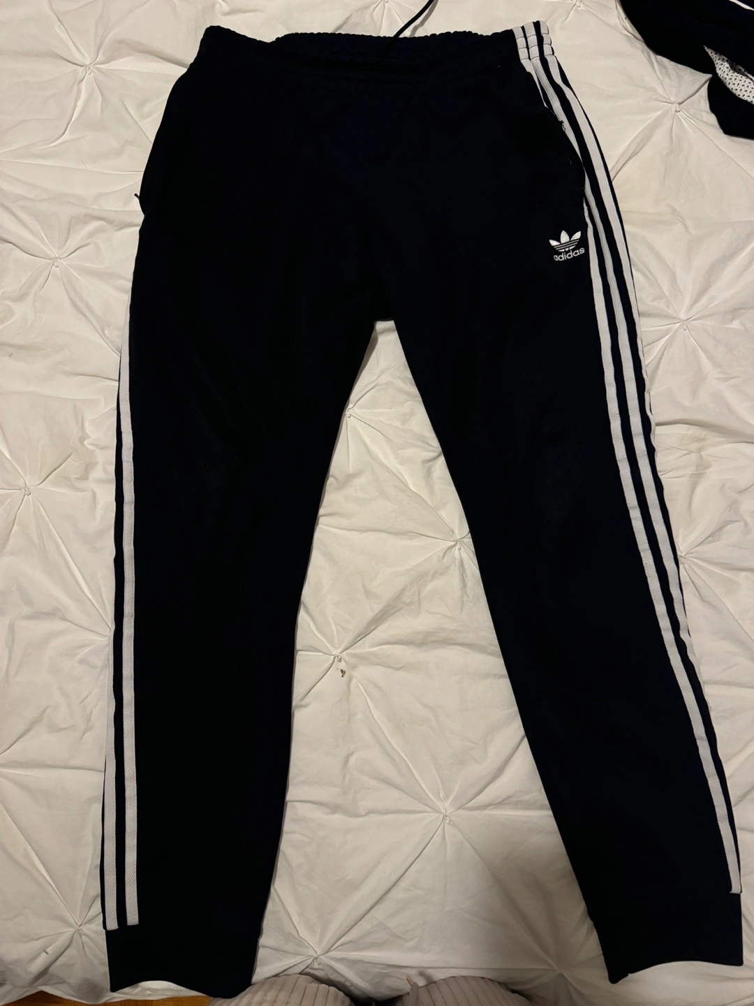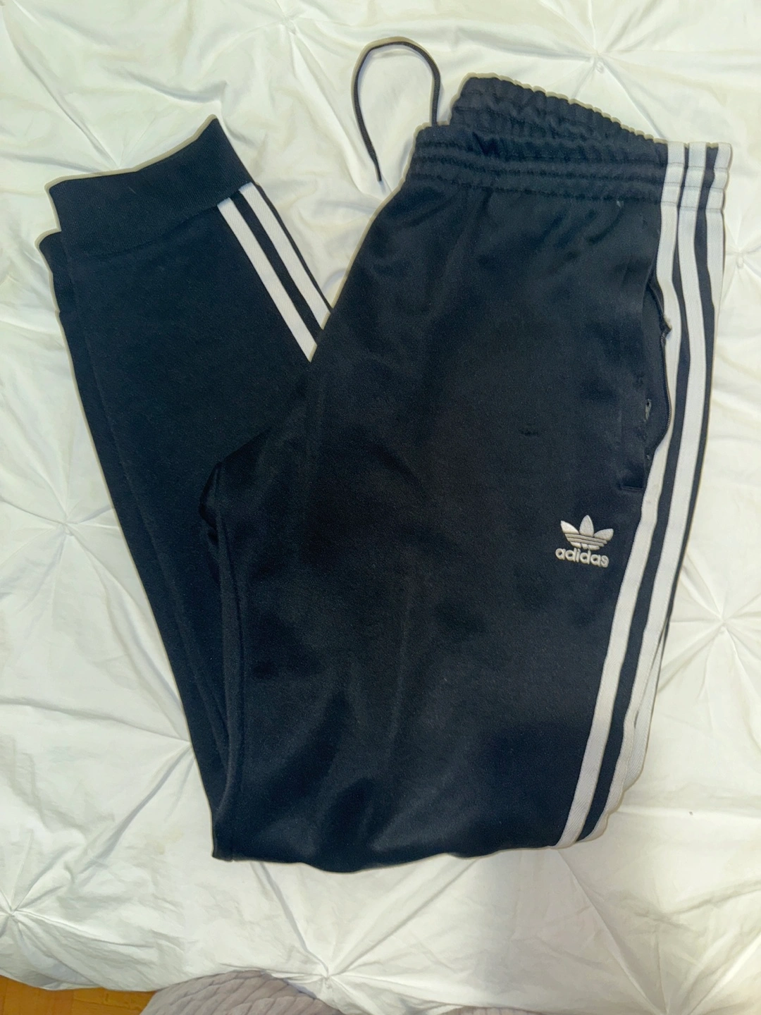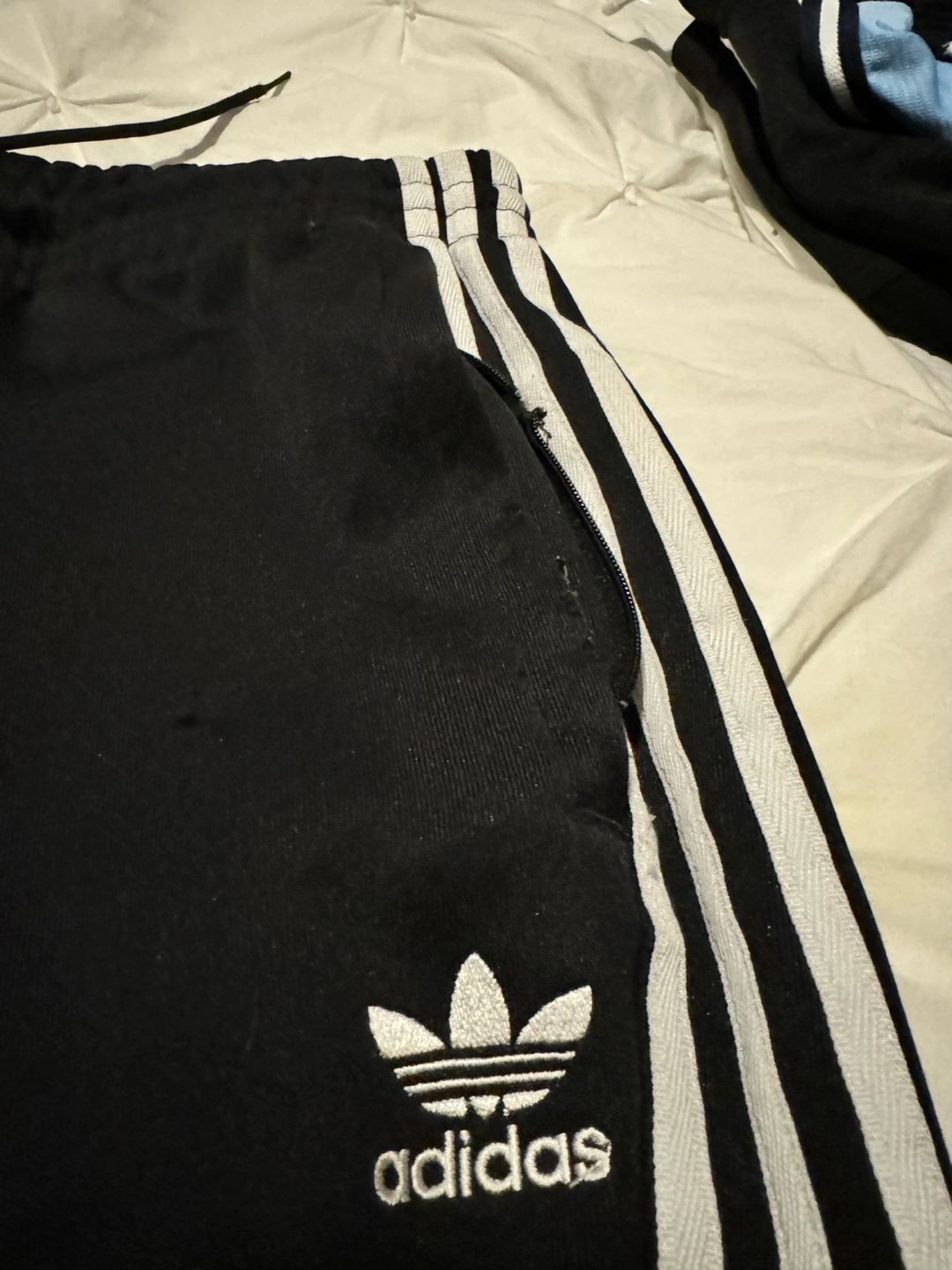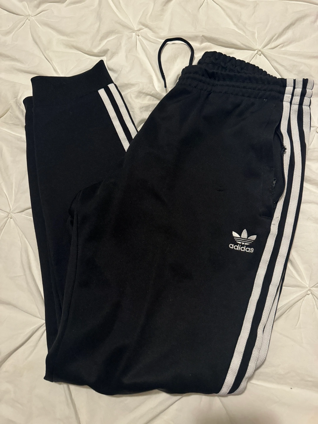Black sweatpants with white stripes on the sides and a white Adidas logo on the left leg.