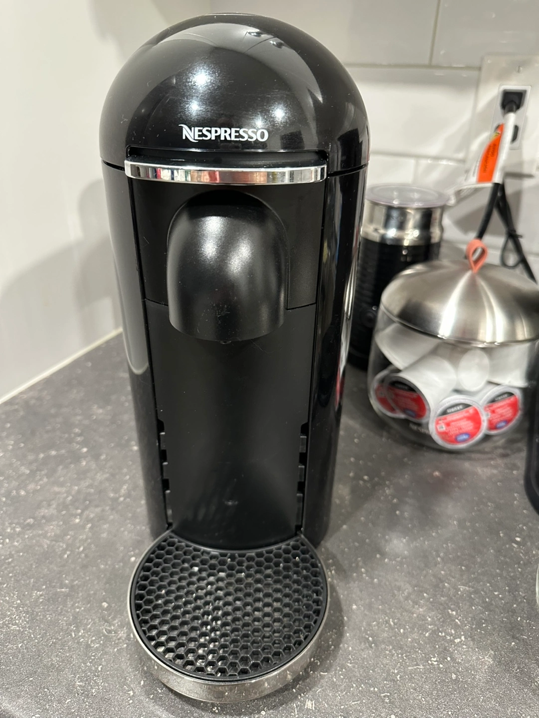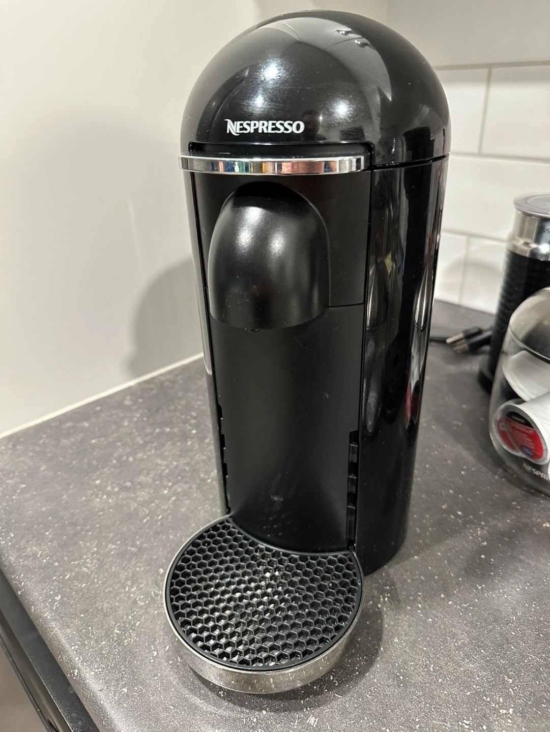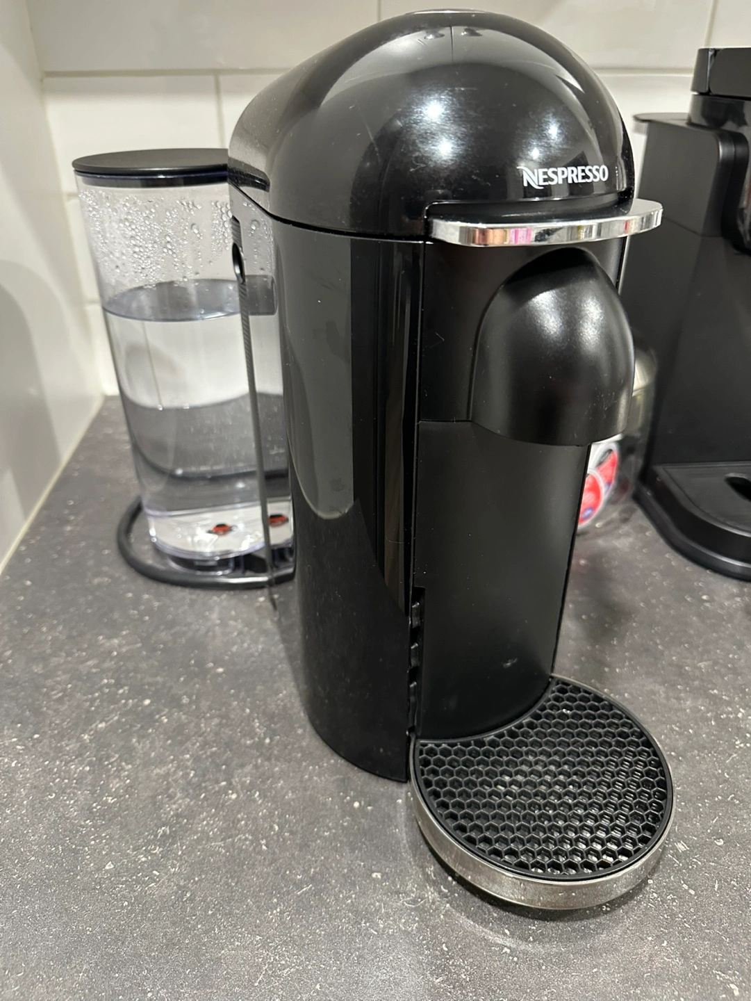 Black Nespresso coffee machine. Comes with drip tray and water tank. In great condition, like new. Added pod glass bowl.