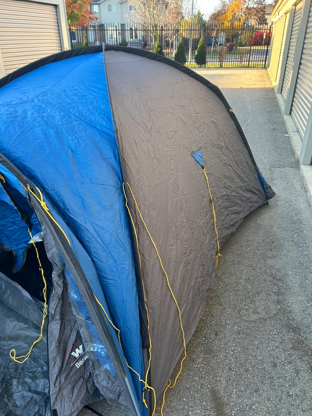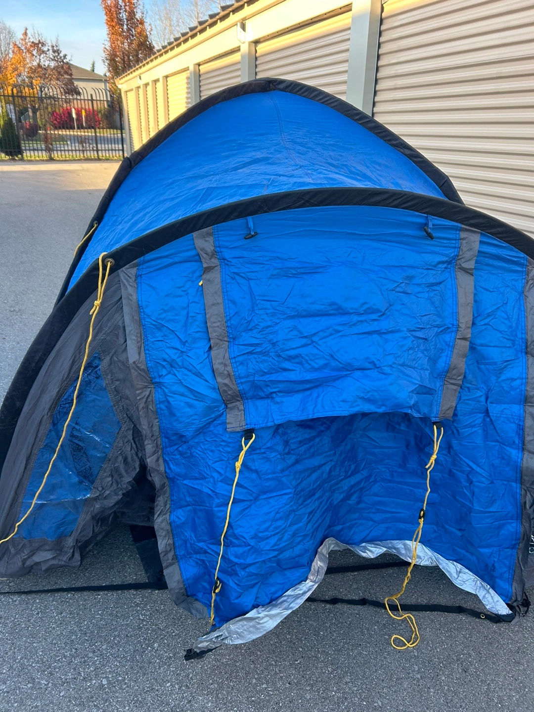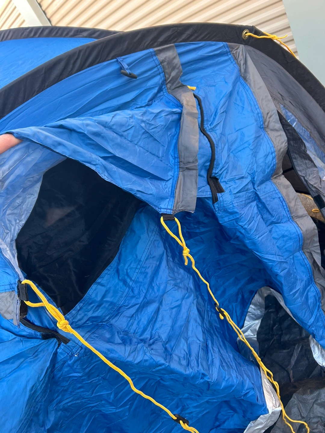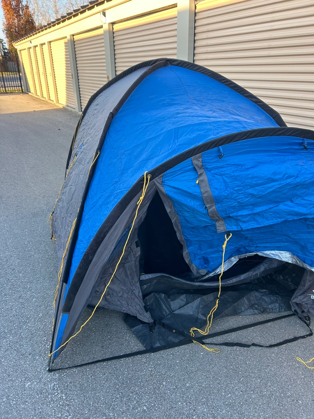 Used camping tent in an excellent shape. Blue and grey with black accents and yellow cords.