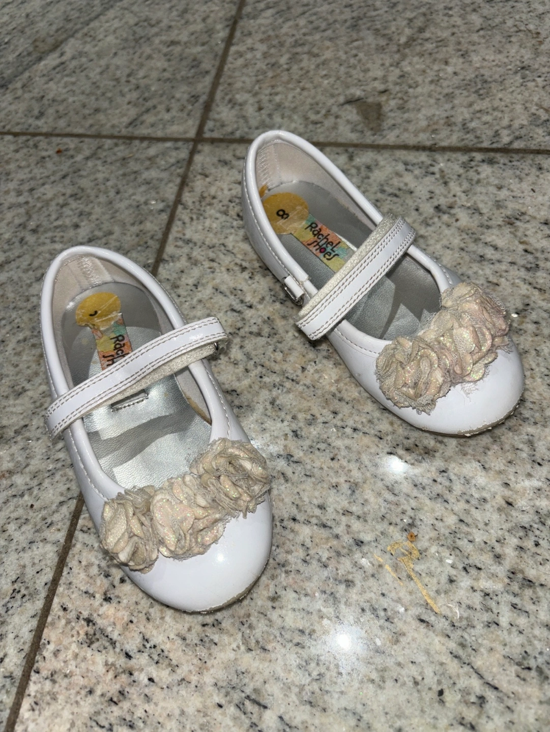 White patent leather toddler girls shoes with a flower embellishment. Size 8. Non-slip soles.