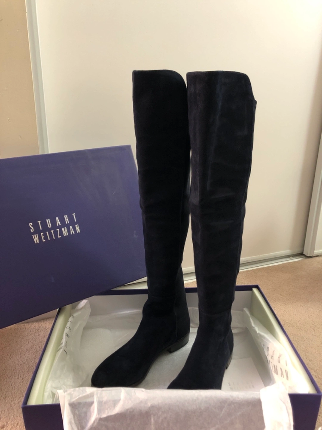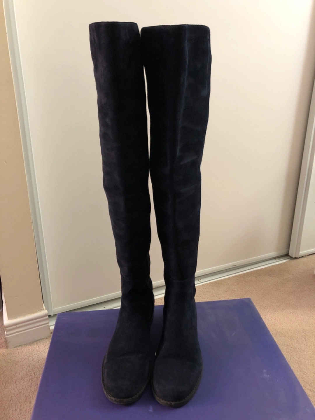 Suede over the knee boots. Navy blue colour. Includes original box.