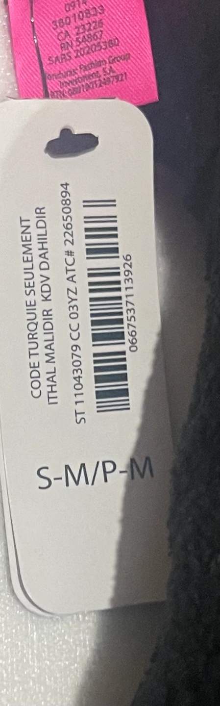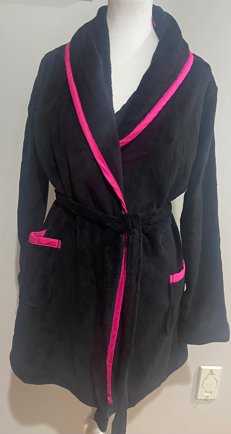 Black fleece robe with pink trim. Has pockets and a self-tie belt. Size S-M/P-M