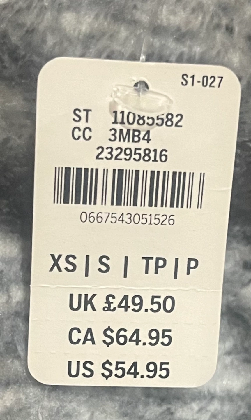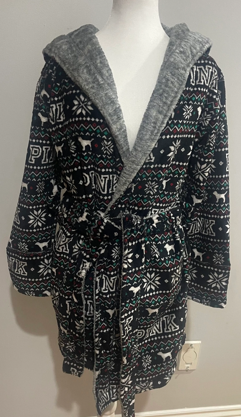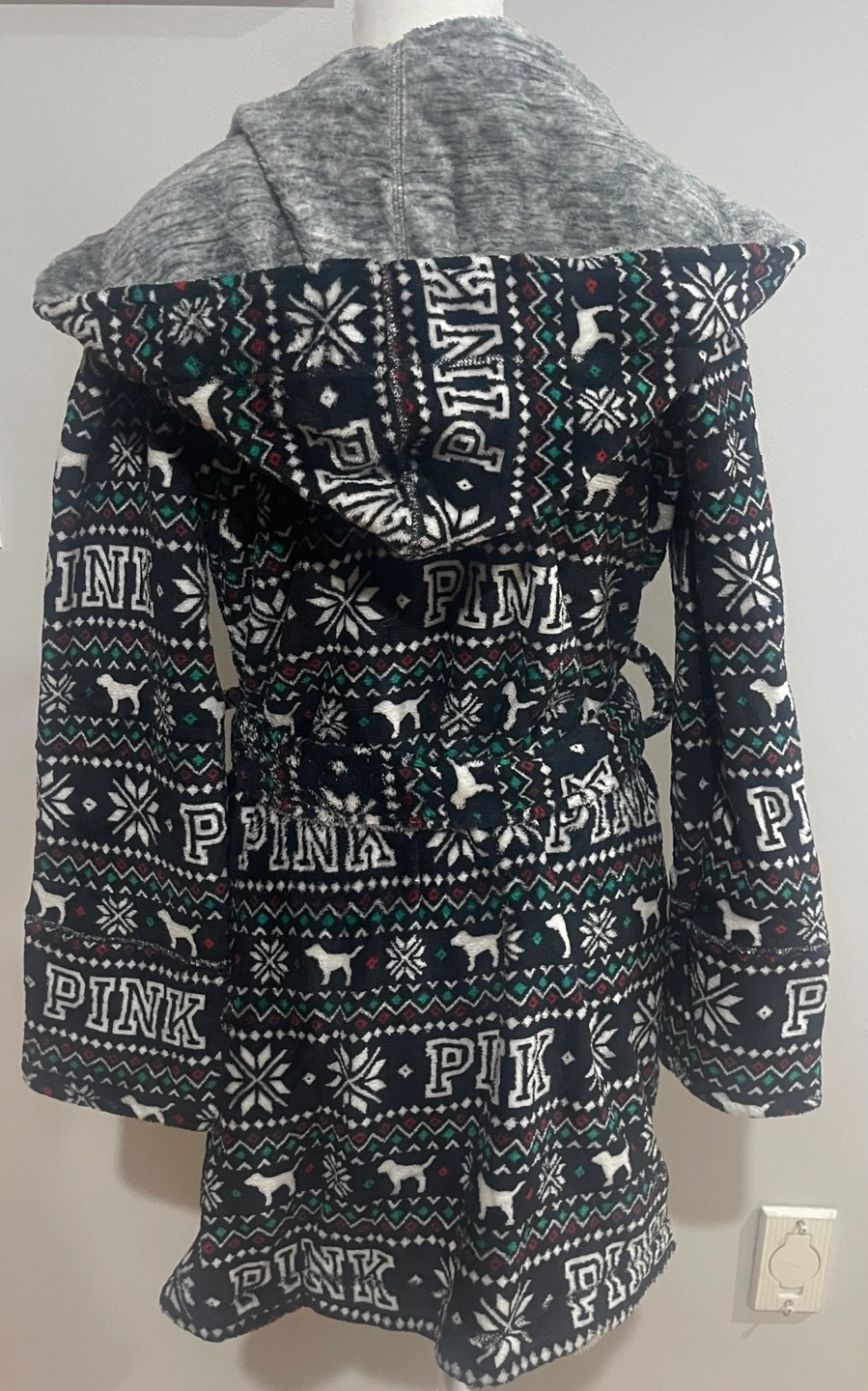 Black fleece robe with a grey hood. Features a festive holiday pattern and a self-tie belt.