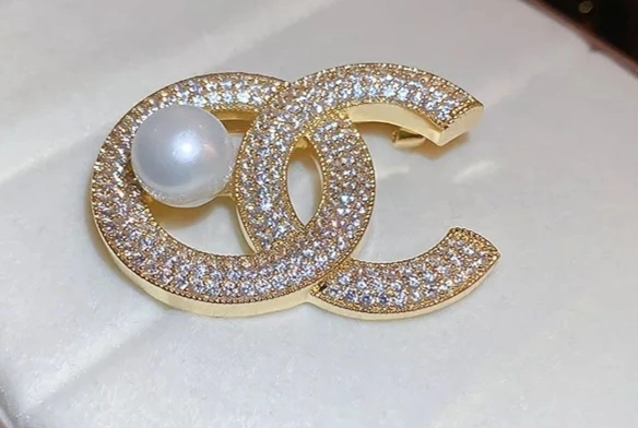 Gold Ch style Rhinestones and Pearl Brooch