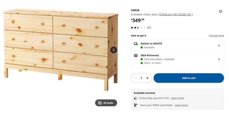1 / 31 / 3Buy & SellIKEA TARVA 6-Drawer Chest Pick Up OnlyIKEA TARVA 6-Drawer Chest Pick Up Only$150Six drawer chest, solid pine wood, assembled. Good condition.ConditionLike newWHERE TO MEETCheck LocationView MapSELLERDavidRiley Park291 review0 chats·1 favorites·27 viewsSEND CHAT TO SELLERHi David! I’m interested in your listing.Hi David! I’m interested in your listing.Get the Karrot app to chatSign In to chat