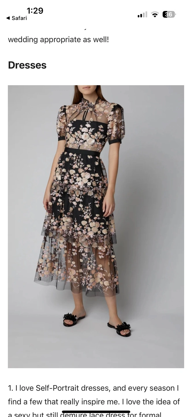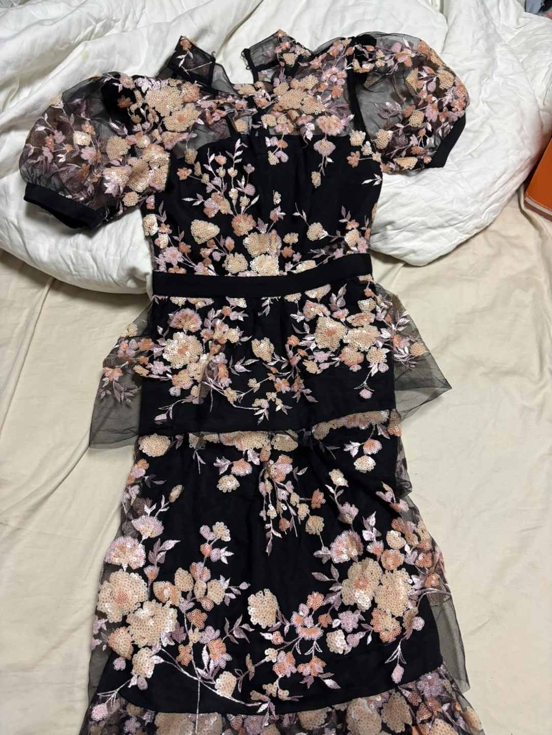 Black floral embroidered tulle dress with puff sleeves and tiered skirt. Wedding appropriate.